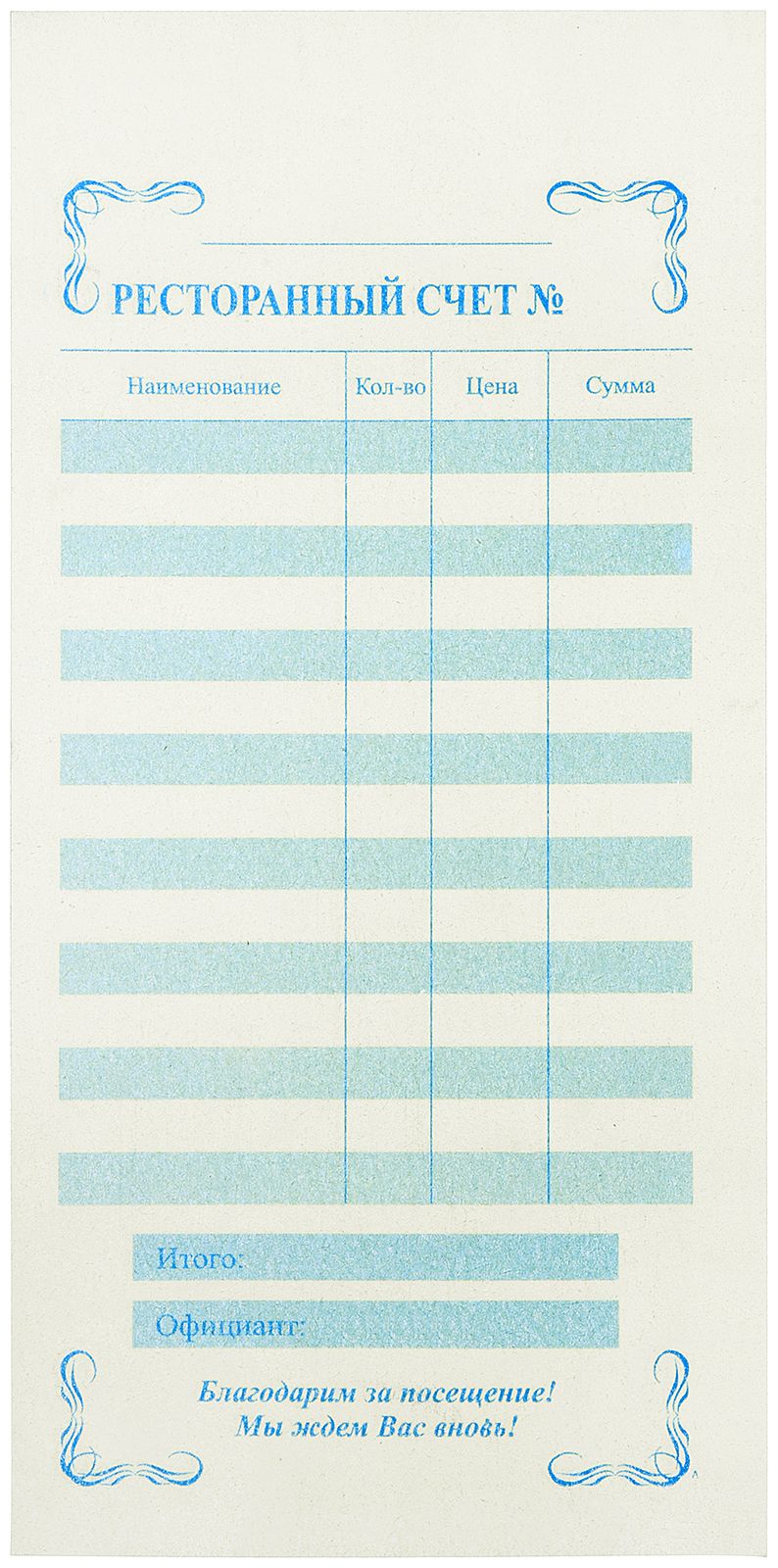 Формат: А5 Плотность, г/м2: 55 Количество листов: 50 Тип крепления: склейка Материал обложки: мелованный картон Вид изделия: Бланк Мин. партия и варианты упаковок: 1 / 50 Бланк самокопирующийся двухслойный INFORMAT РЕСТОРАННЫЙ СЧЕТ А5 (97 х 200 мм), 50 комплектов, склейка, офсет, картонная обложка с подложкой