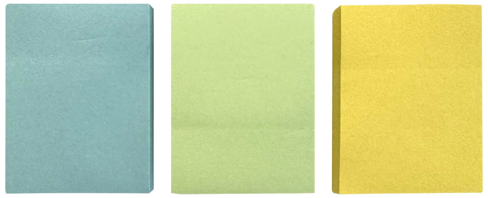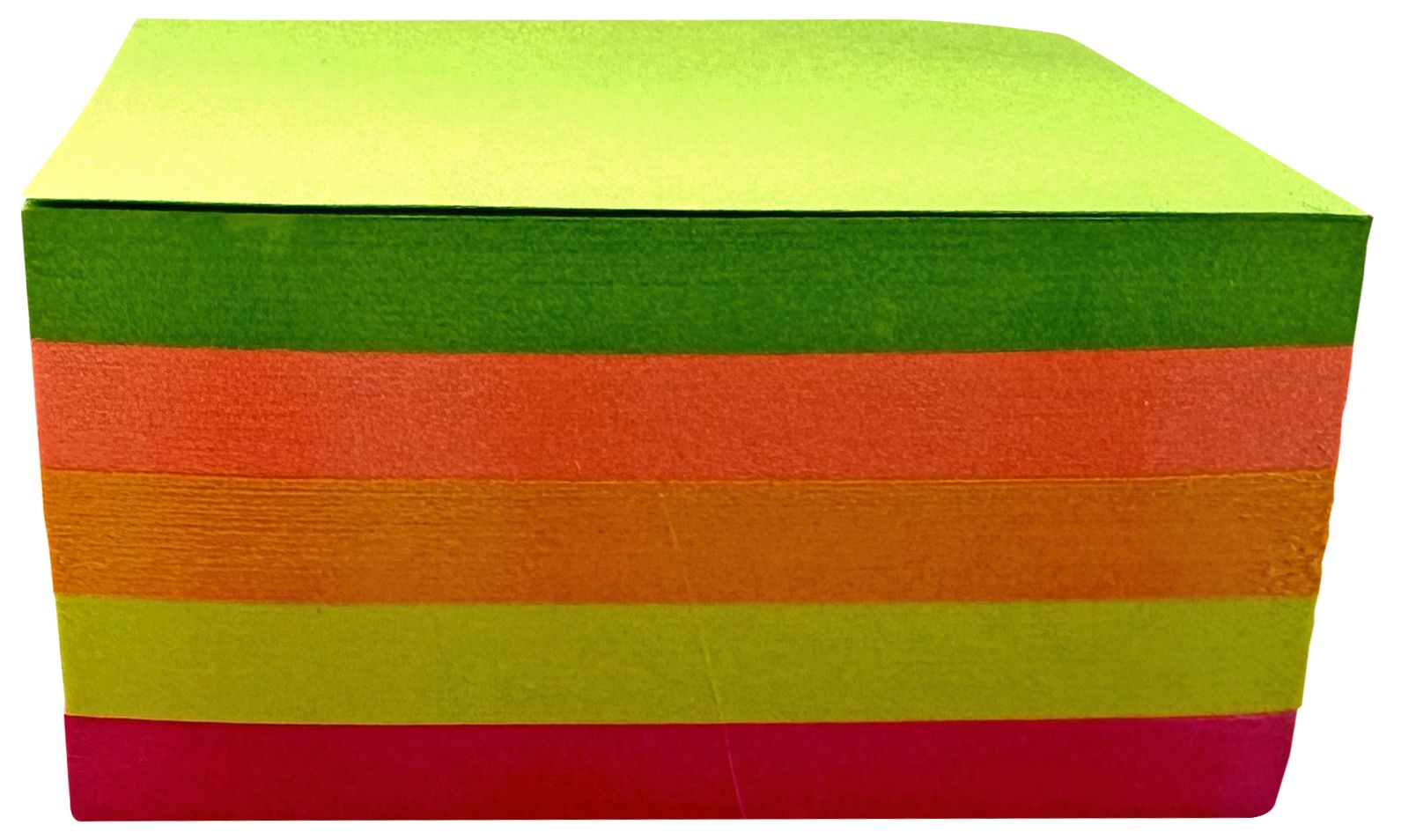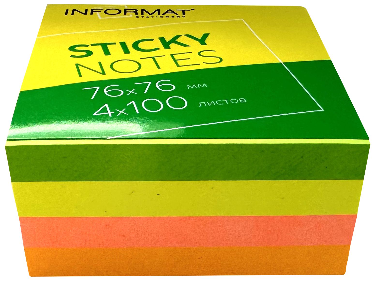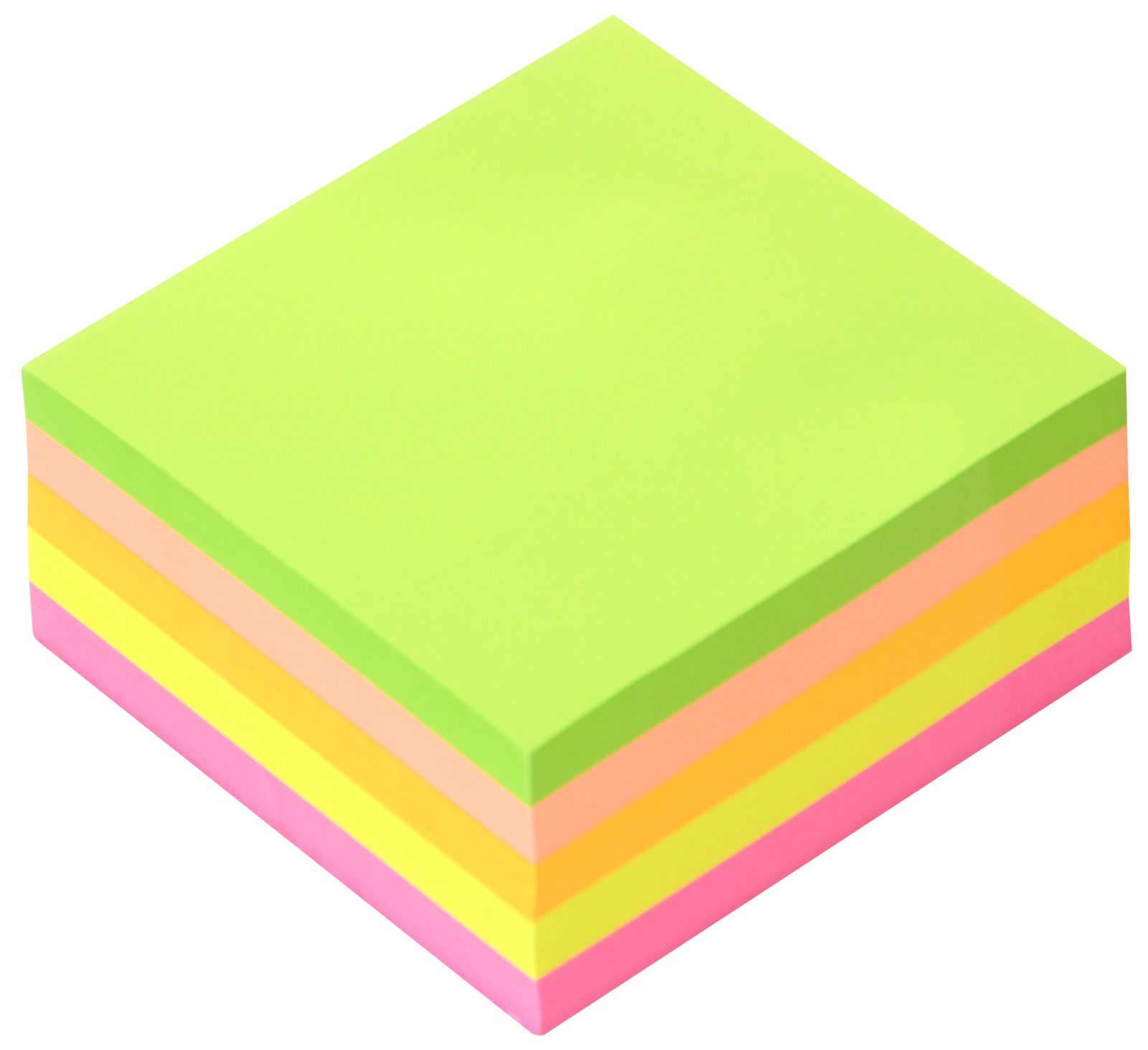 Производители канцелярских товаров изготавливают блоки в различных цветах: желтом, неоновом, зеленом, пастельном. Стандартный формат листка – квадрат со стороной 76 мм.