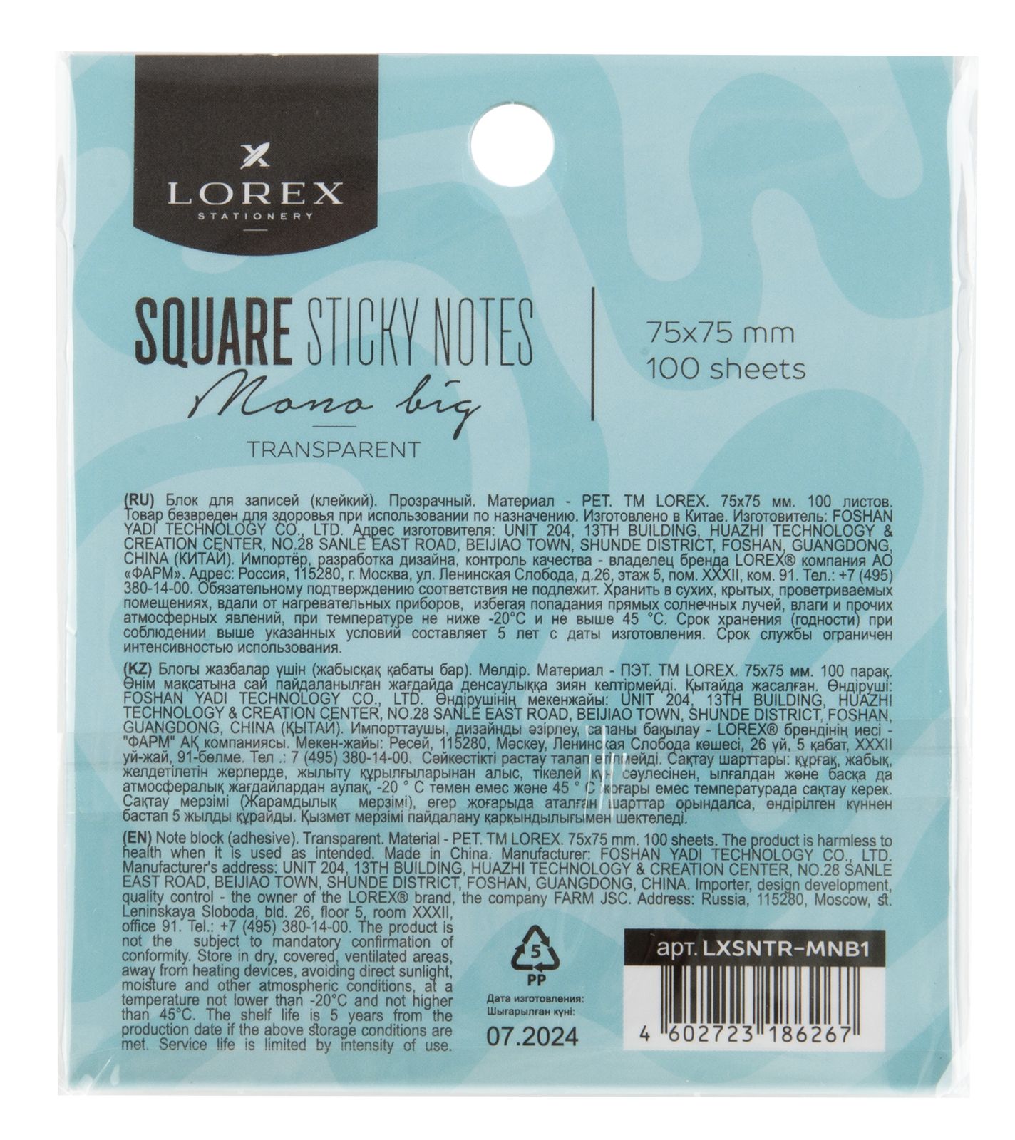 Цвет: прозрачный Количество в упаковке, шт: 1 Количество листов: 100 Линовка: без линовки Размер: 75х75 мм Количество цветов: 1 Мин. партия и варианты упаковок: 1 / 12 / 216 Блок самоклеящийся прозрачный LOREX TRANSPARENT MONO BIG 75х75 мм 100 листов
