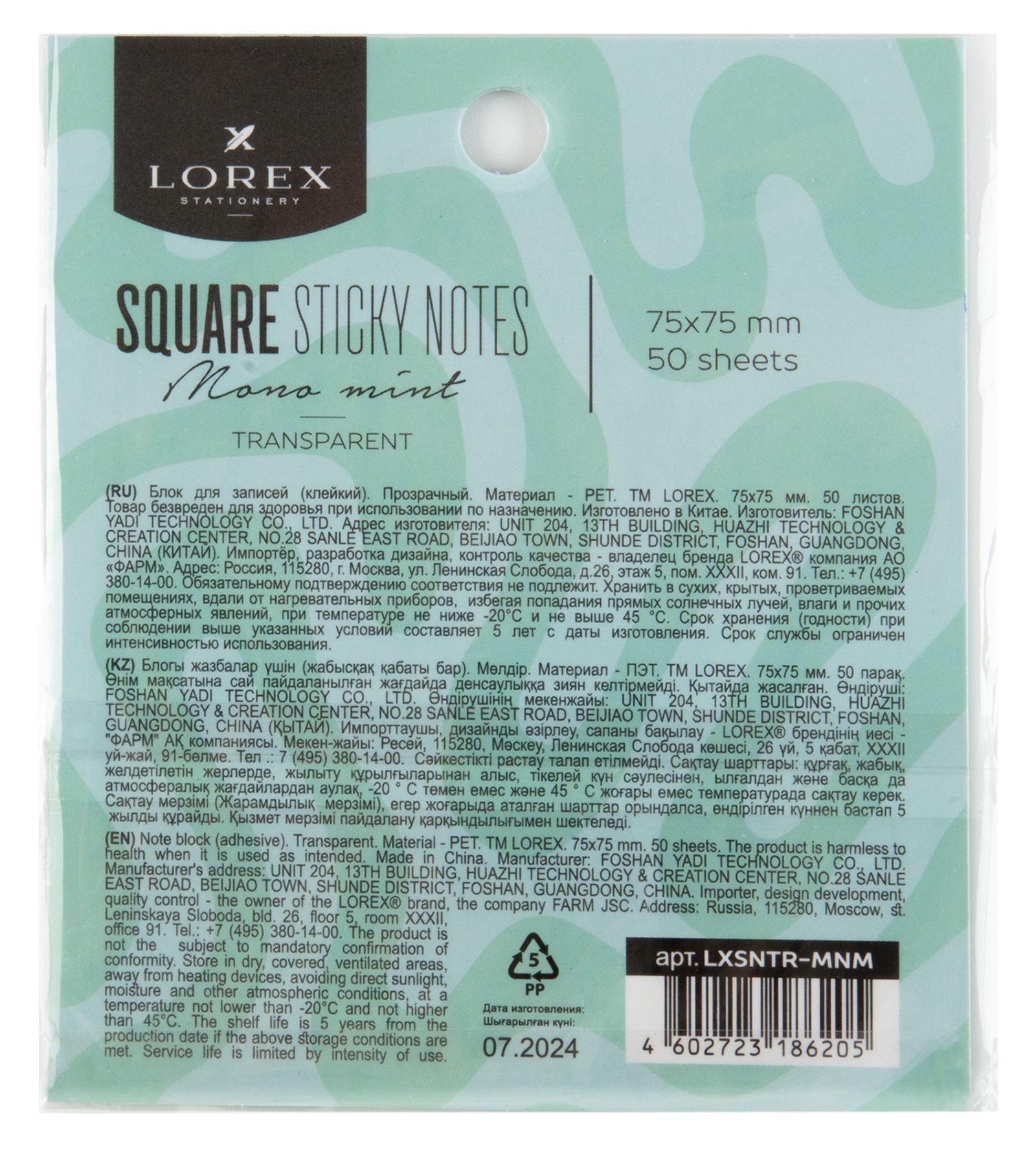 Цвет: мятный Количество в упаковке, шт: 1 Количество листов: 50 Линовка: без линовки Размер: 75х75 мм Количество цветов: 1 Мин. партия и варианты упаковок: 1 / 24 / 432 Блок самоклеящийся прозрачный LOREX TRANSPARENT MONO MINT 75х75 мм 50 листов, мятный