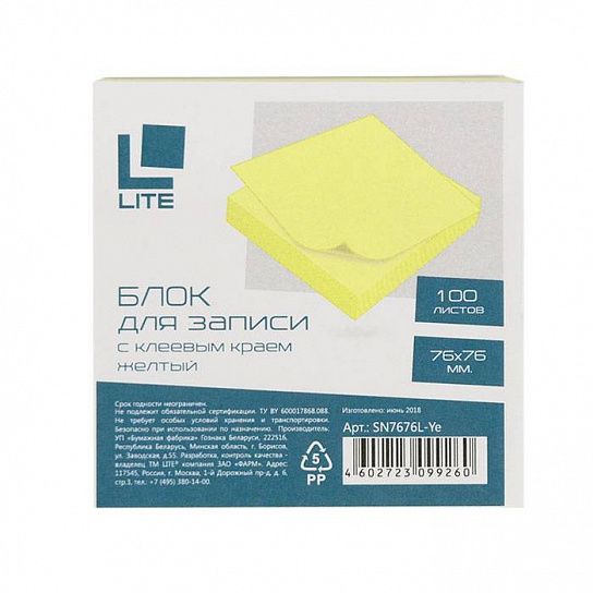 Цвет: желтый Плотность, г/м2: 60 Количество в упаковке, шт: 1 Количество листов: 100 Линовка: без линовки Размер: 76х76 мм Мин. партия и варианты упаковок: 1 / 12 / 432 Блок самоклеящийся LITE 76х76 мм, 100 листов, желтый