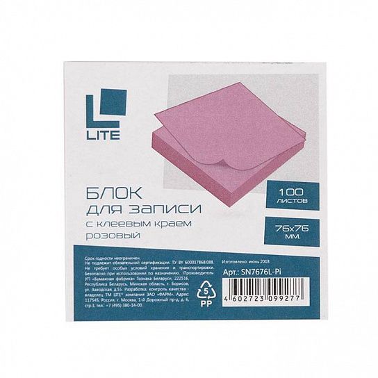 Цвет: розовый Плотность, г/м2: 60 Количество в упаковке, шт: 1 Количество листов: 100 Линовка: без линовки Размер: 76х76 мм Мин. партия и варианты упаковок: 1 / 12 / 432 Блок самоклеящийся LITE 76х76 мм, 100 листов, розовый