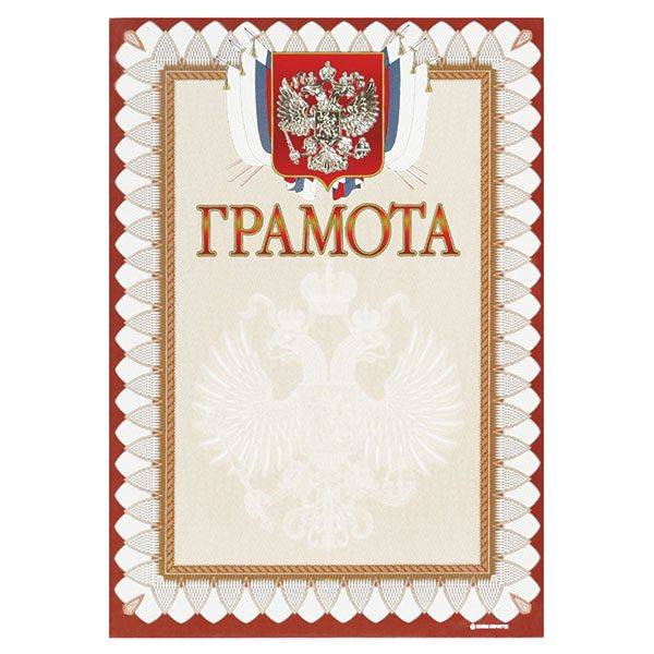 Грамота имеет формат А4. Сделана из прочного картона, на нее нанесено тиснение фольгой. Можно печатать на ней на любом принтере.