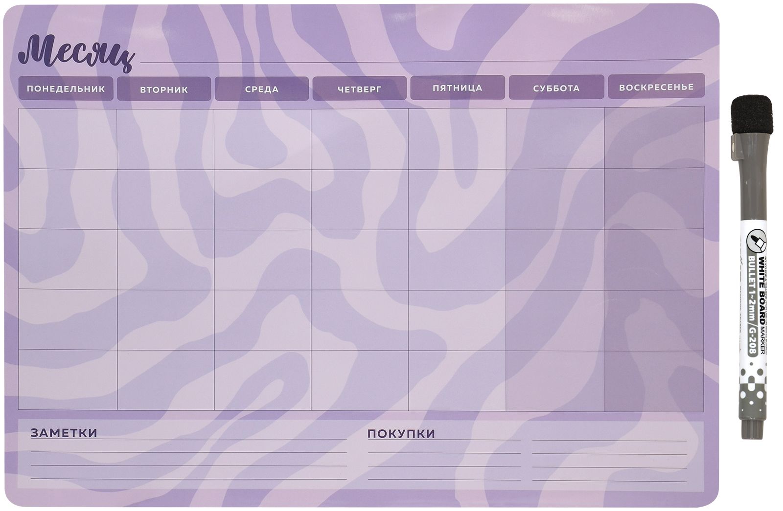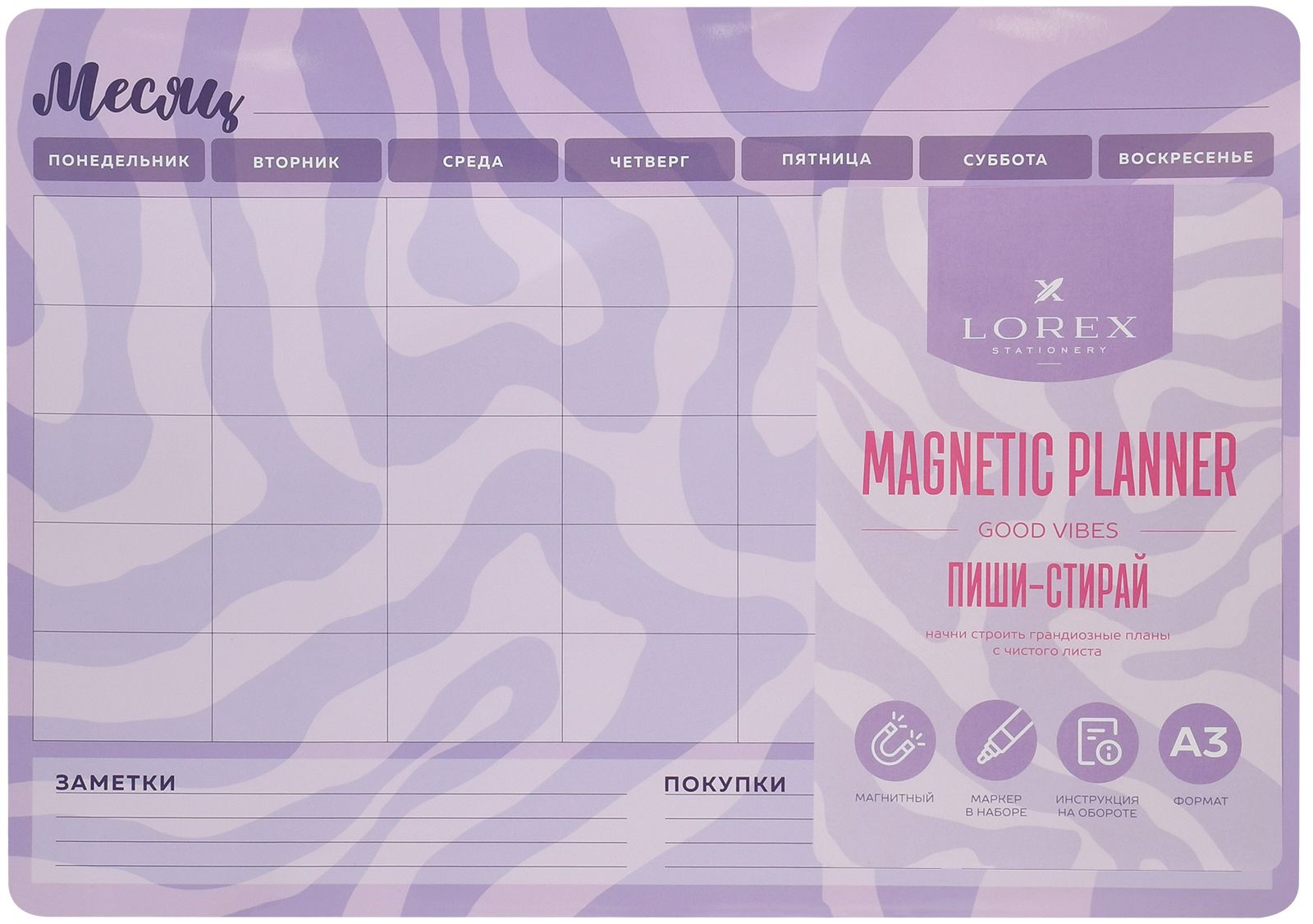 Планер формата А3 выполнен из картона с магнитным винилом и покрыт глянцевой ламинацией, что позволяет многократно писать и стирать надписи. Его легко закрепить на любой металлической поверхности (например, холодильнике).