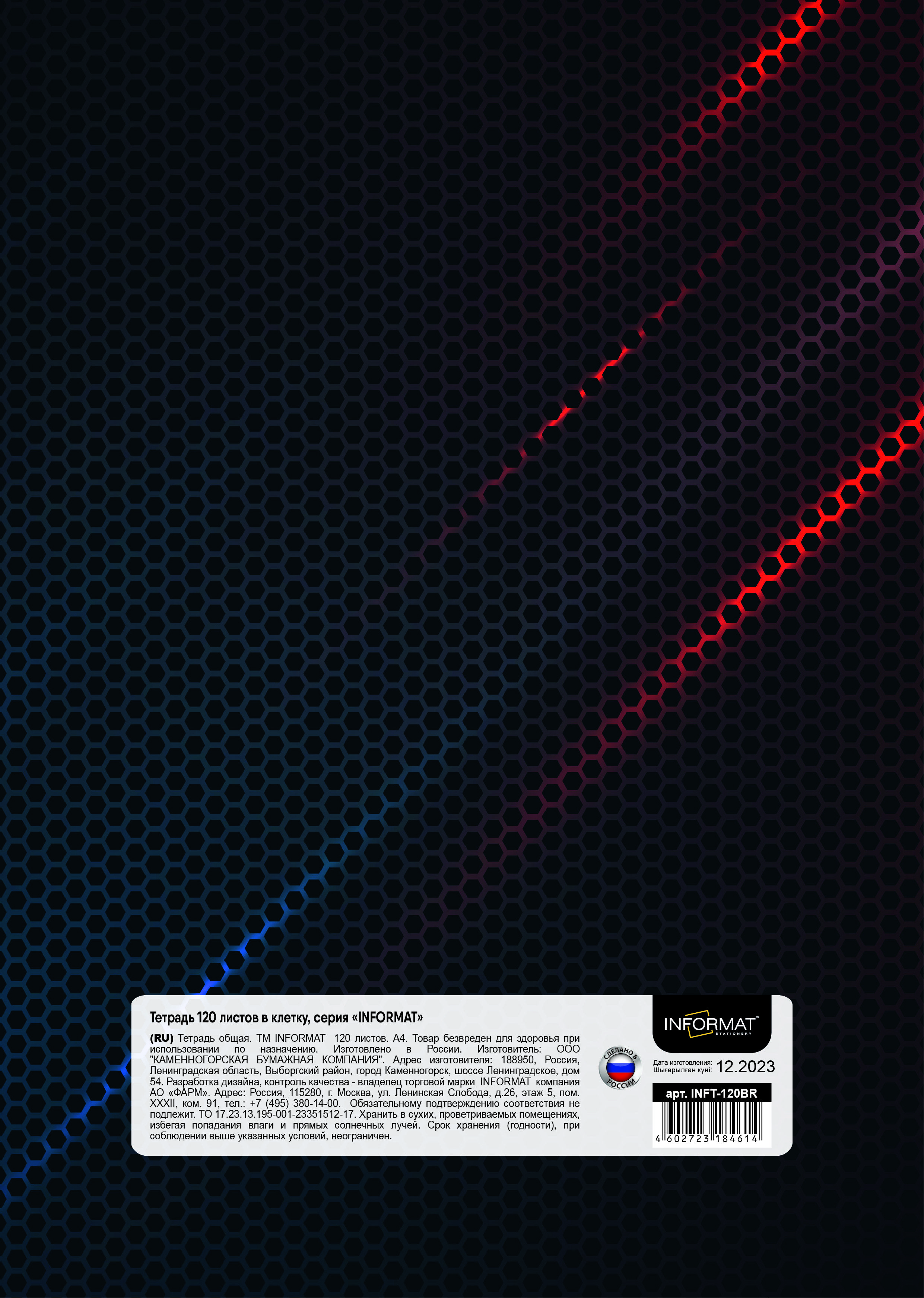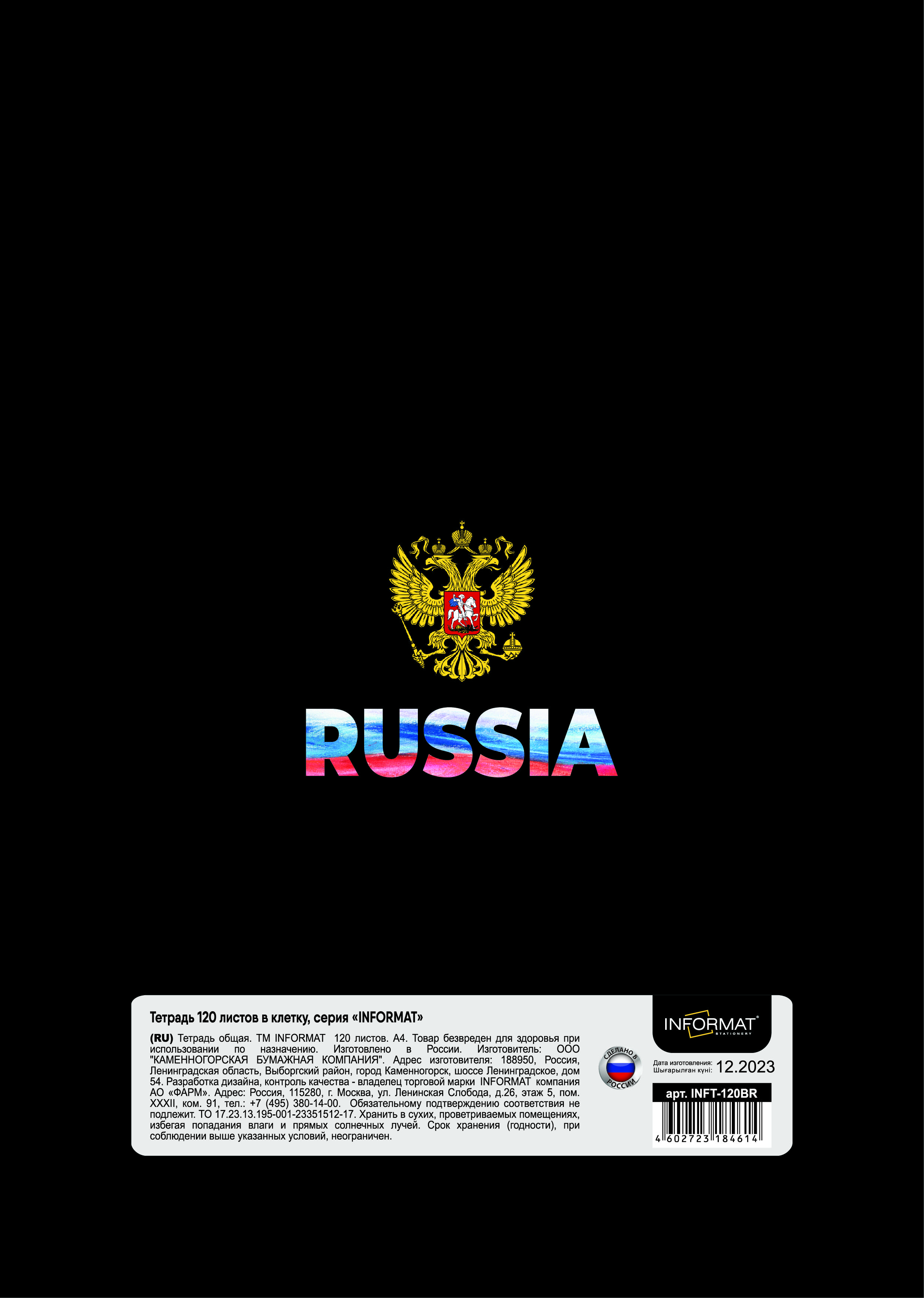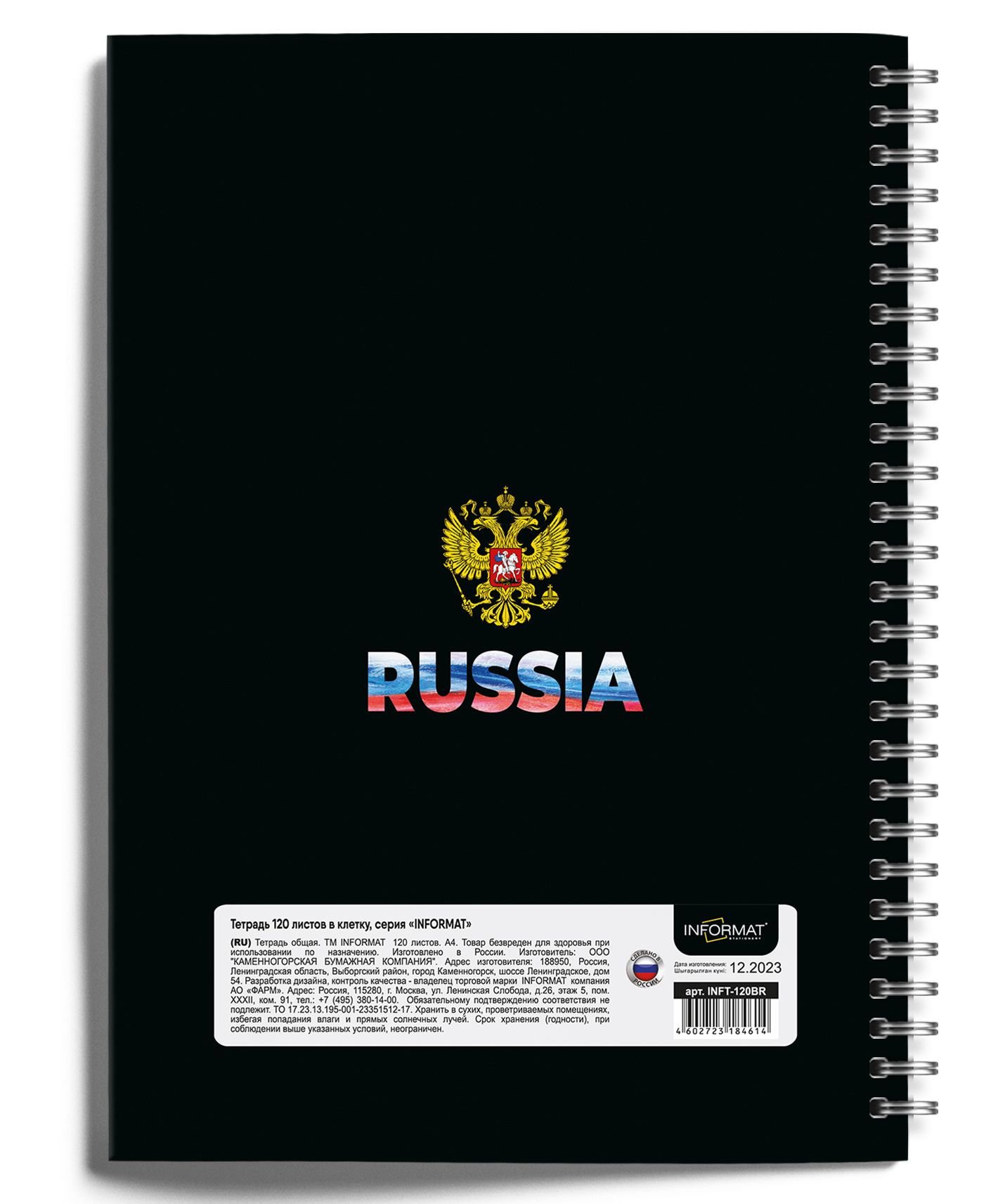 Формат: А4 Количество листов: 120 Тип крепления: гребень Материал обложки: мелованный картон Линовка: клетка Размер: 205х290 мм Мин. партия и варианты упаковок: 1 / 2 / 14 Тетрадь 120 л. А4 клетка, на гребне, INFORMAT ГЕРБ офсет, мелованный картон, матовая ламинация