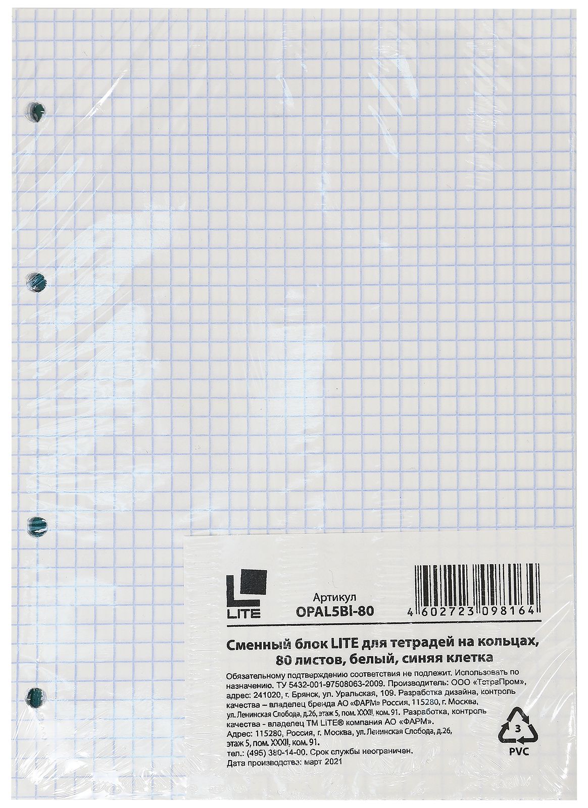 Формат: А5 Количество листов: 160 Линовка: клетка Цвет линовки: синий Упаковка: термопленка Плотность блока, г/м2: 60 Мин. партия и варианты упаковок: 1 / 30 Сменный блок 160 л. А5, линовка: синяя клетка, LITE