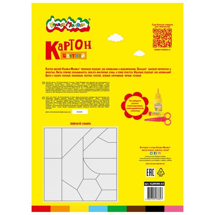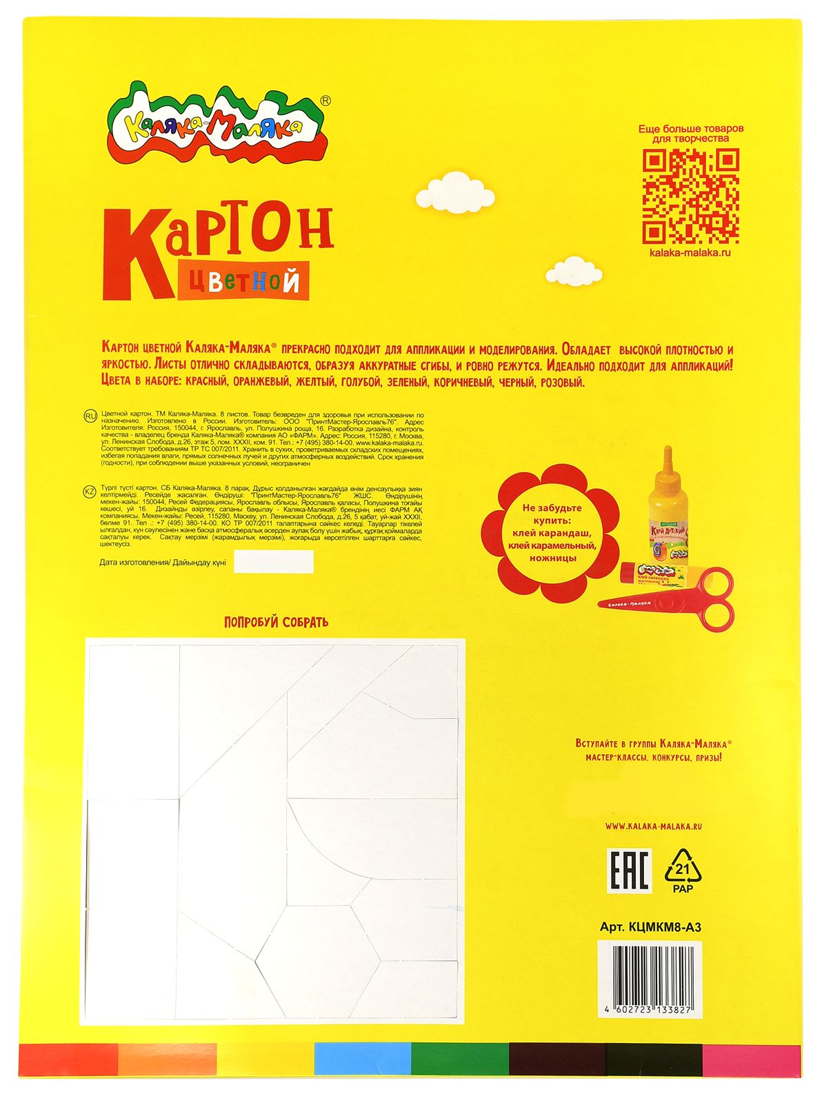 Формат: А3 Плотность, г/м2: 200 Количество листов: 8 Количество цветов: 8 Наличие европодвеса: Нет Упаковка: картонная папка Мин. партия и варианты упаковок: 1 / 25 Картон цветной мелованный Каляка-Маляка А3, 8 цветов 8 листов, 200 г/м2