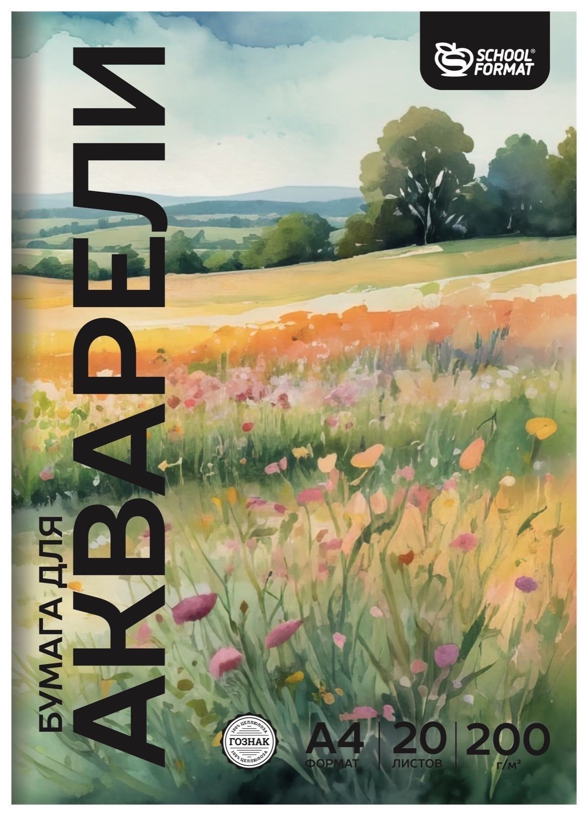 Папка для акварели Schoolformat формата А4 содержит 20 листов рисовальной бумаги марки А, производства СПБФ "Гознак", плотностью 200 г/м2.