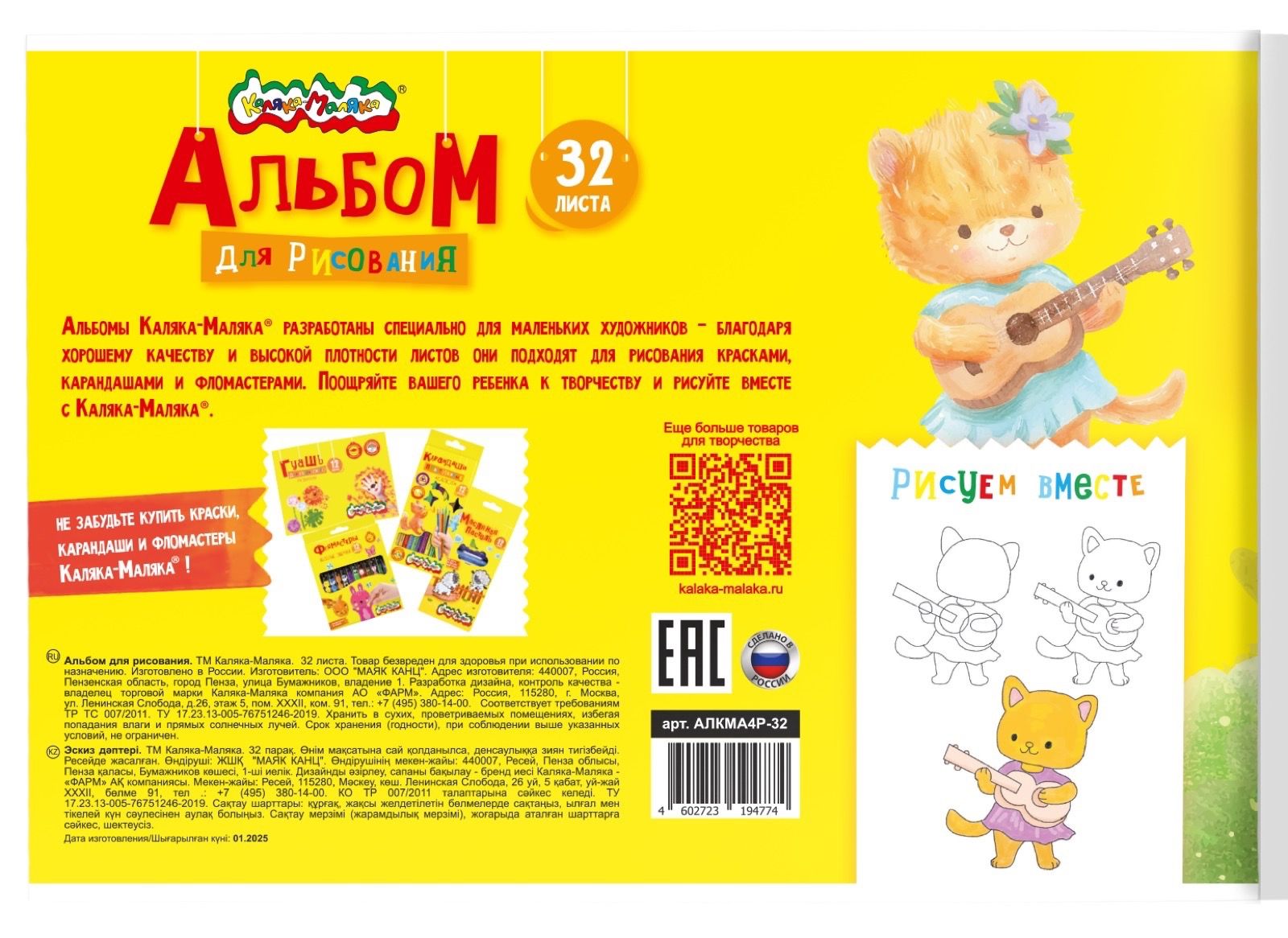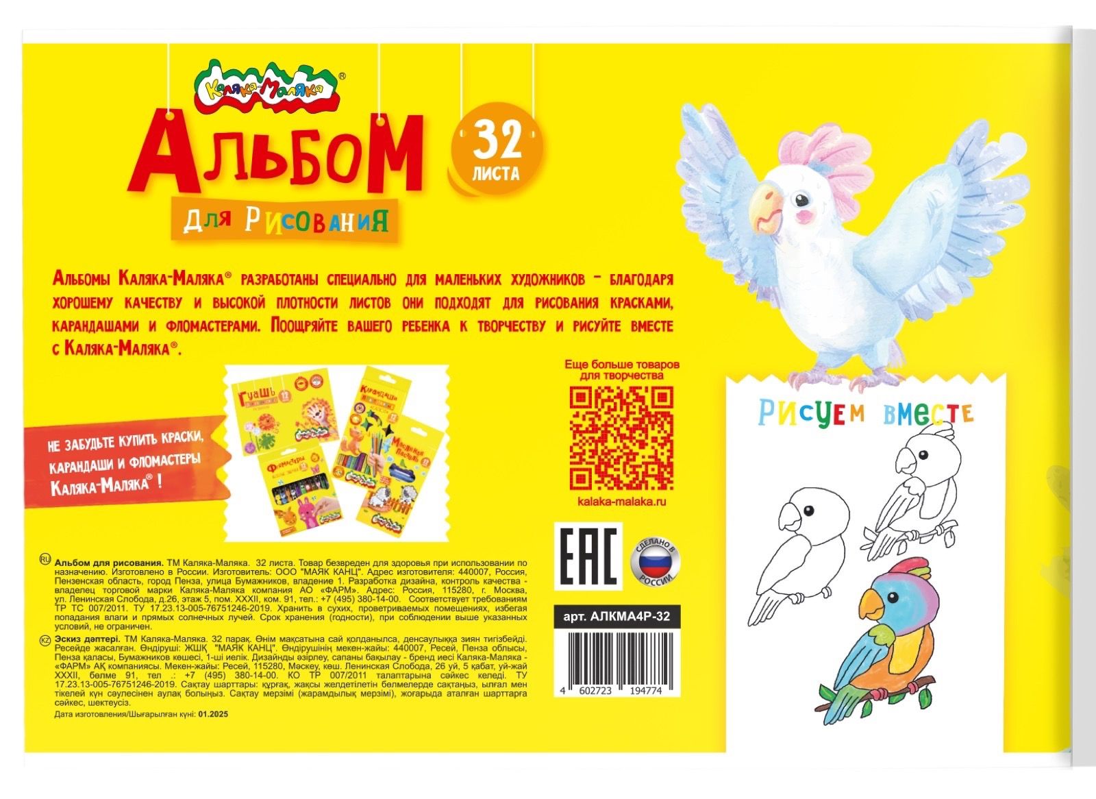 Формат: А4 Количество листов: 32 Тип крепления: скрепка Материал обложки: мелованный картон Вид продукции для творчества: Альбом для рисования Вид бумаги внутреннего блока: офсет Мин. партия и варианты упаковок: 1 / 8 / 40 Альбом для рисования 32 л. А4, скрепка Каляка-Маляка мелованный картон, ВД-лак, офсетная бумага, раскраска на обложке