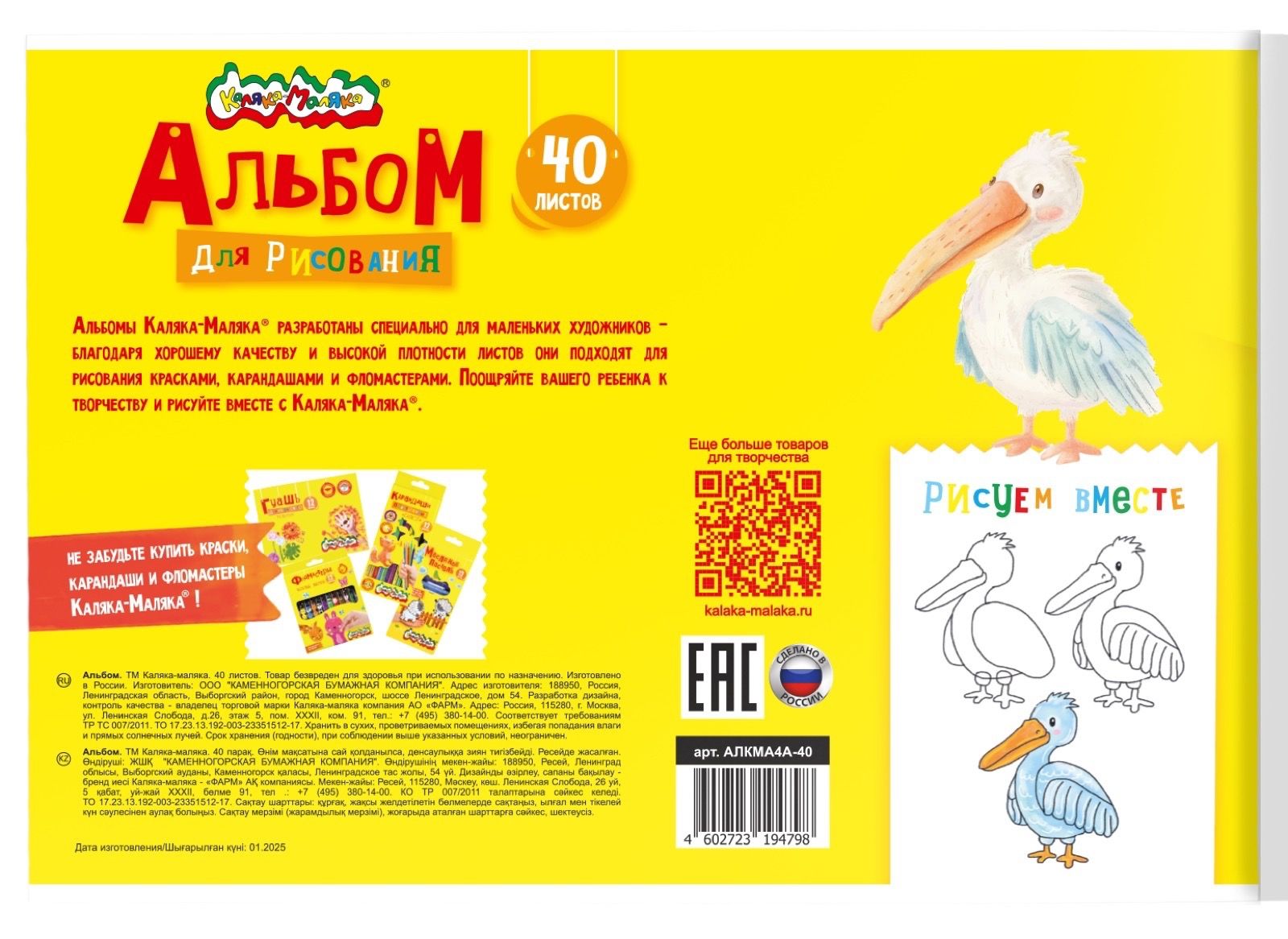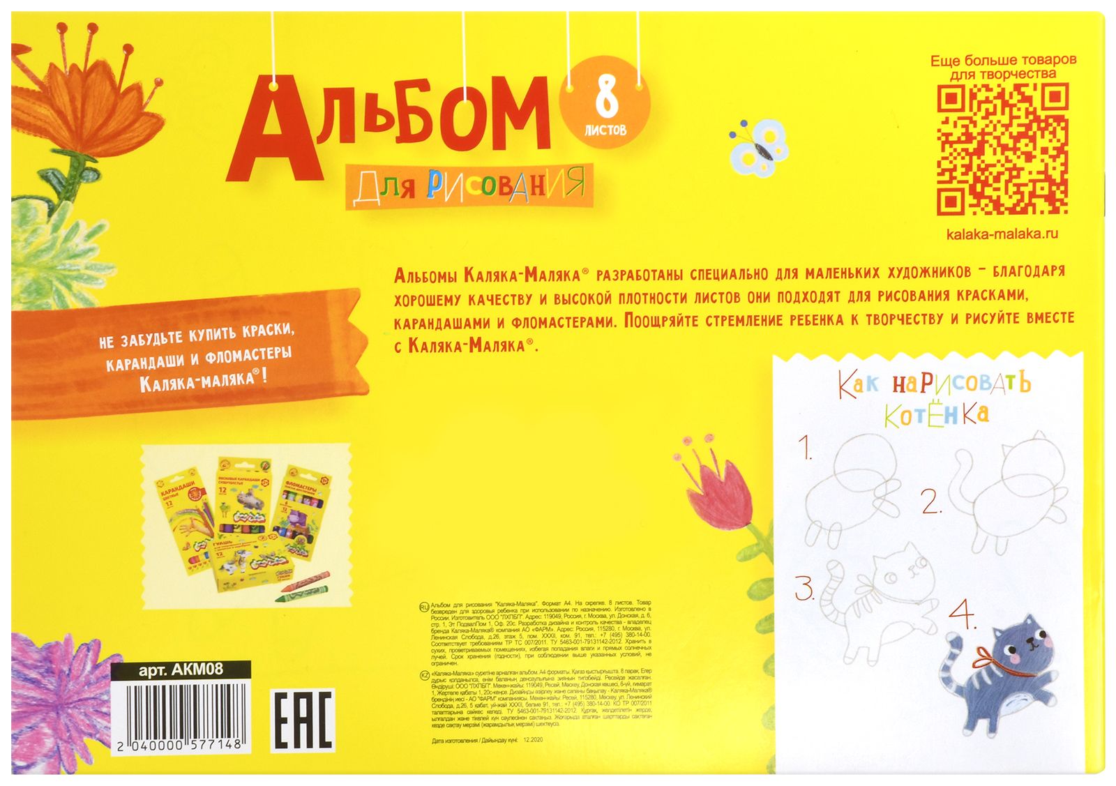 Формат: А4 Количество листов: 40 Тип крепления: скрепка Материал обложки: мелованный картон Вид продукции для творчества: Альбом для рисования Вид бумаги внутреннего блока: офсет Мин. партия и варианты упаковок: 1 / 8 / 40 Альбом для рисования 40 л. А4, скрепка Каляка-Маляка мелованный картон, ВД-лак, офсетная бумага, раскраска на обложке