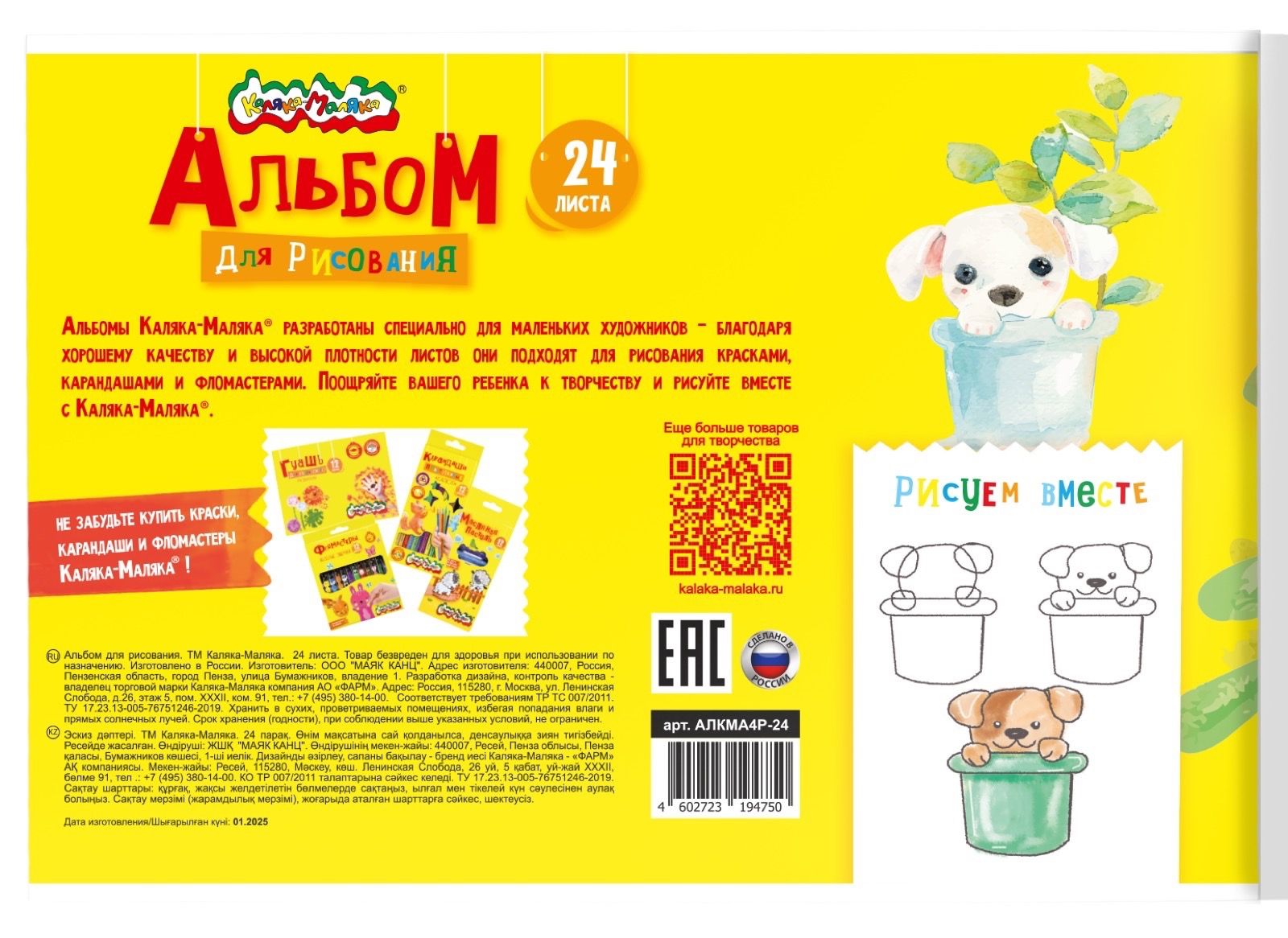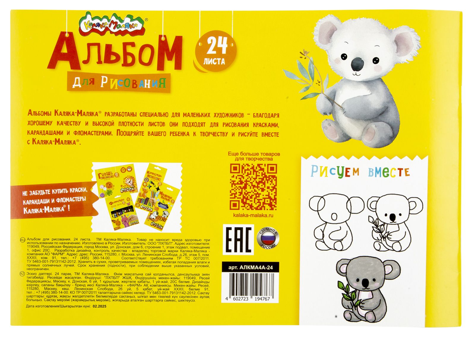 Формат: А4 Количество листов: 24 Тип крепления: скрепка Материал обложки: мелованный картон Вид продукции для творчества: Альбом для рисования Вид бумаги внутреннего блока: офсет Мин. партия и варианты упаковок: 1 / 8 / 64 Альбом для рисования 24 л. А4, скрепка Каляка-Маляка мелованный картон, ВД-лак, офсетная бумага, раскраска на обложке