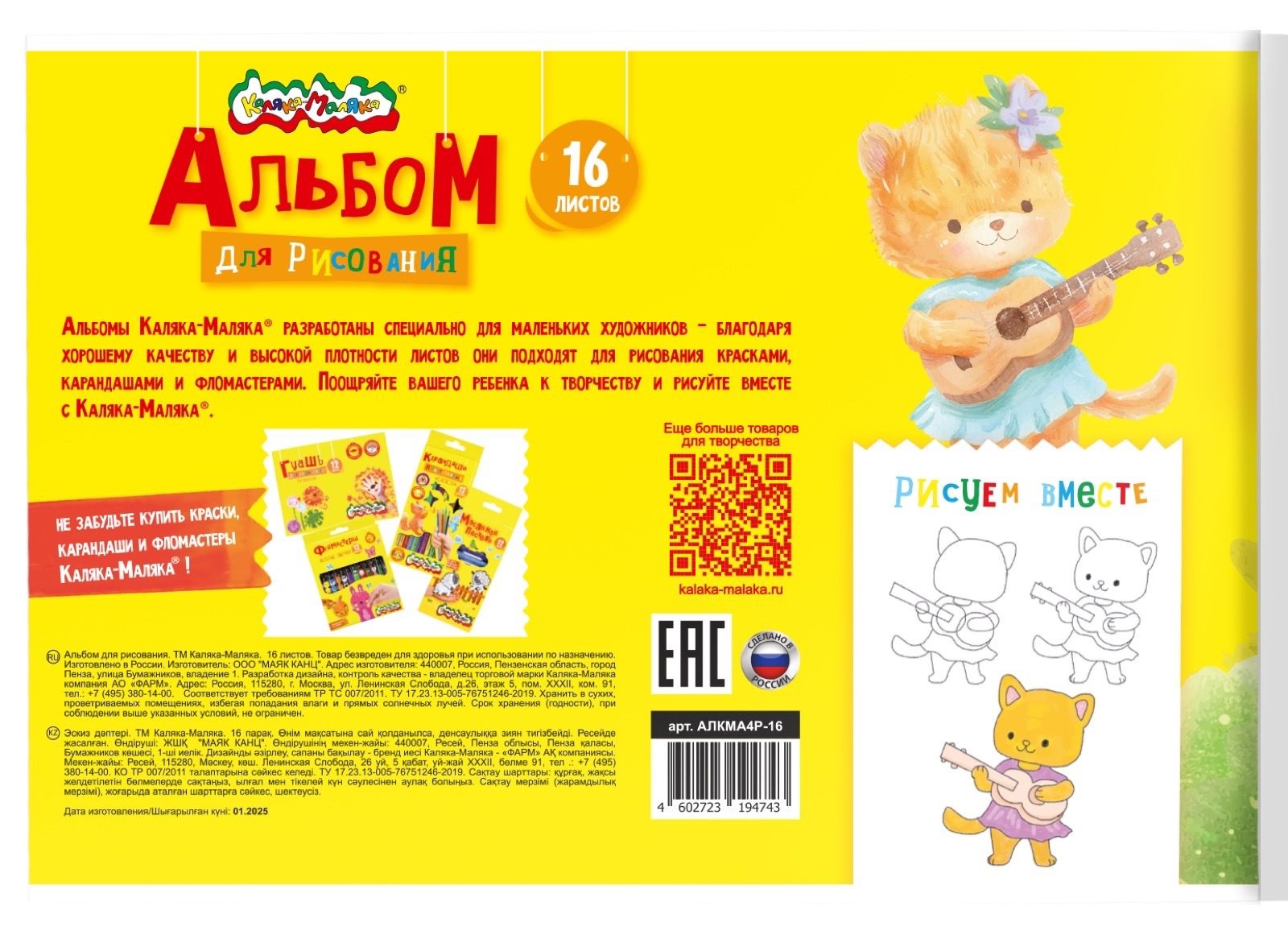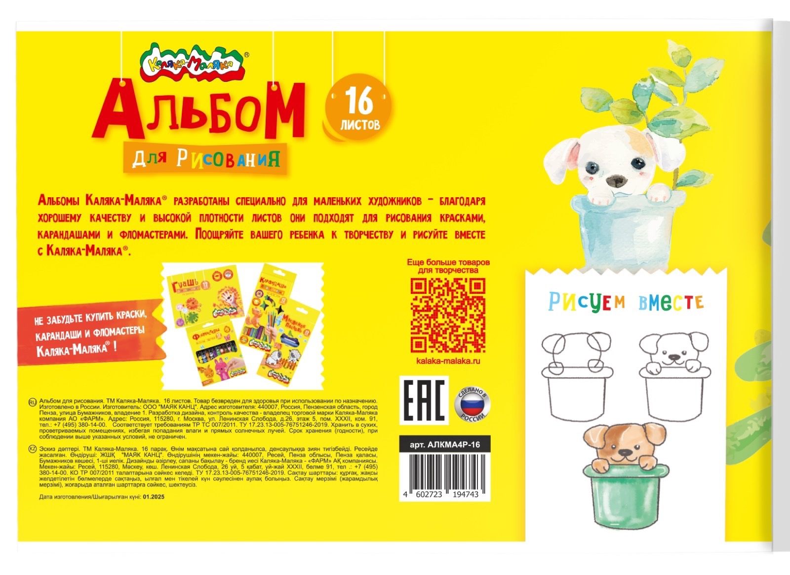Формат: А4 Количество листов: 16 Тип крепления: скрепка Материал обложки: мелованный картон Вид продукции для творчества: Альбом для рисования Вид бумаги внутреннего блока: офсет Мин. партия и варианты упаковок: 1 / 10 / 100 Альбом для рисования 16 л. А4, скрепка Каляка-Маляка мелованный картон, ВД-лак, офсетная бумага, раскраска на обложке