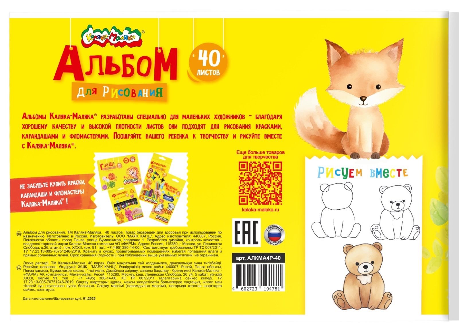 Формат: А4 Количество листов: 40 Тип крепления: склейка Материал обложки: мелованный картон Вид продукции для творчества: Альбом для рисования Вид бумаги внутреннего блока: офсет Мин. партия и варианты упаковок: 1 / 20 Альбом для рисования 40 л. А4, склейка Каляка-Маляка мелованный картон, ВД-лак, офсетная бумага