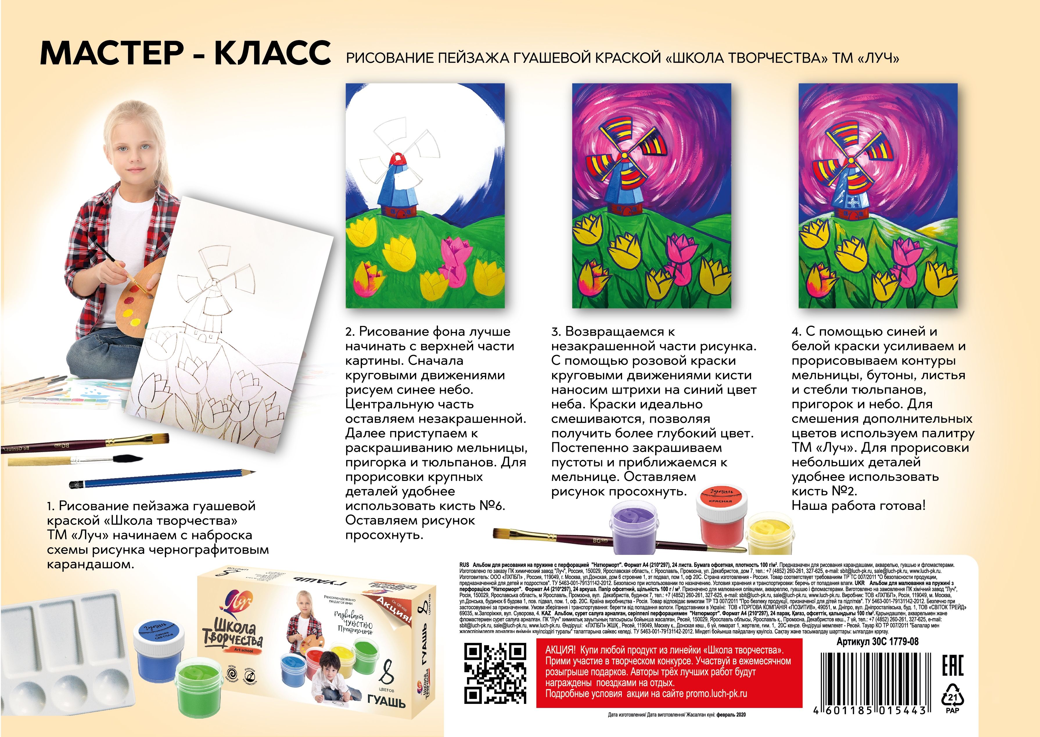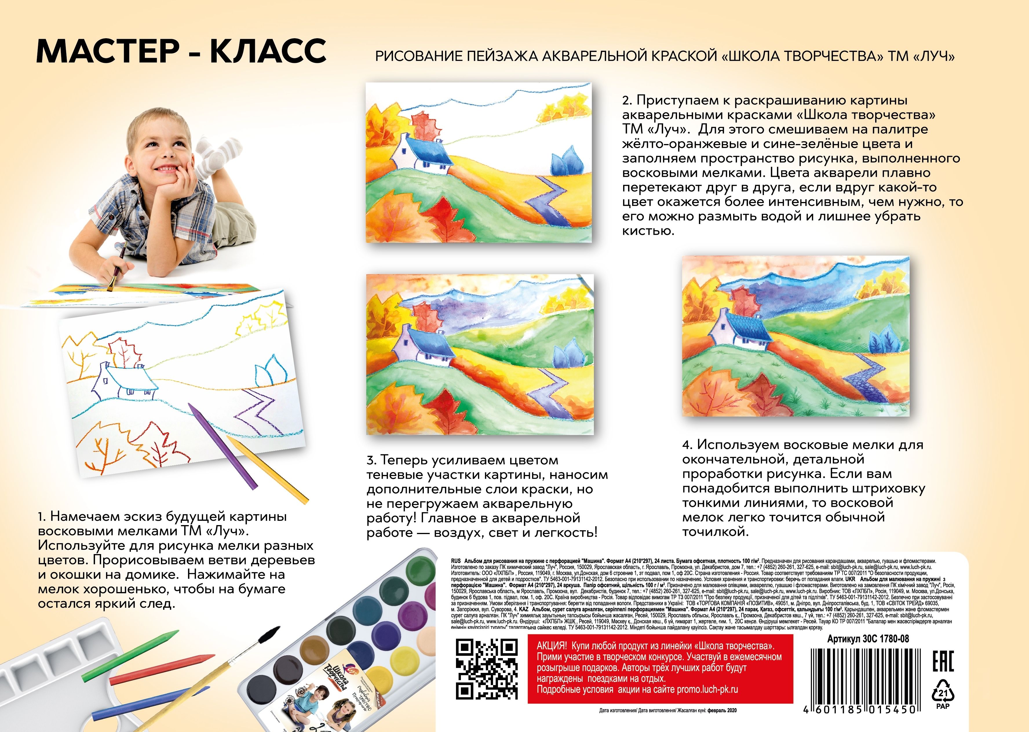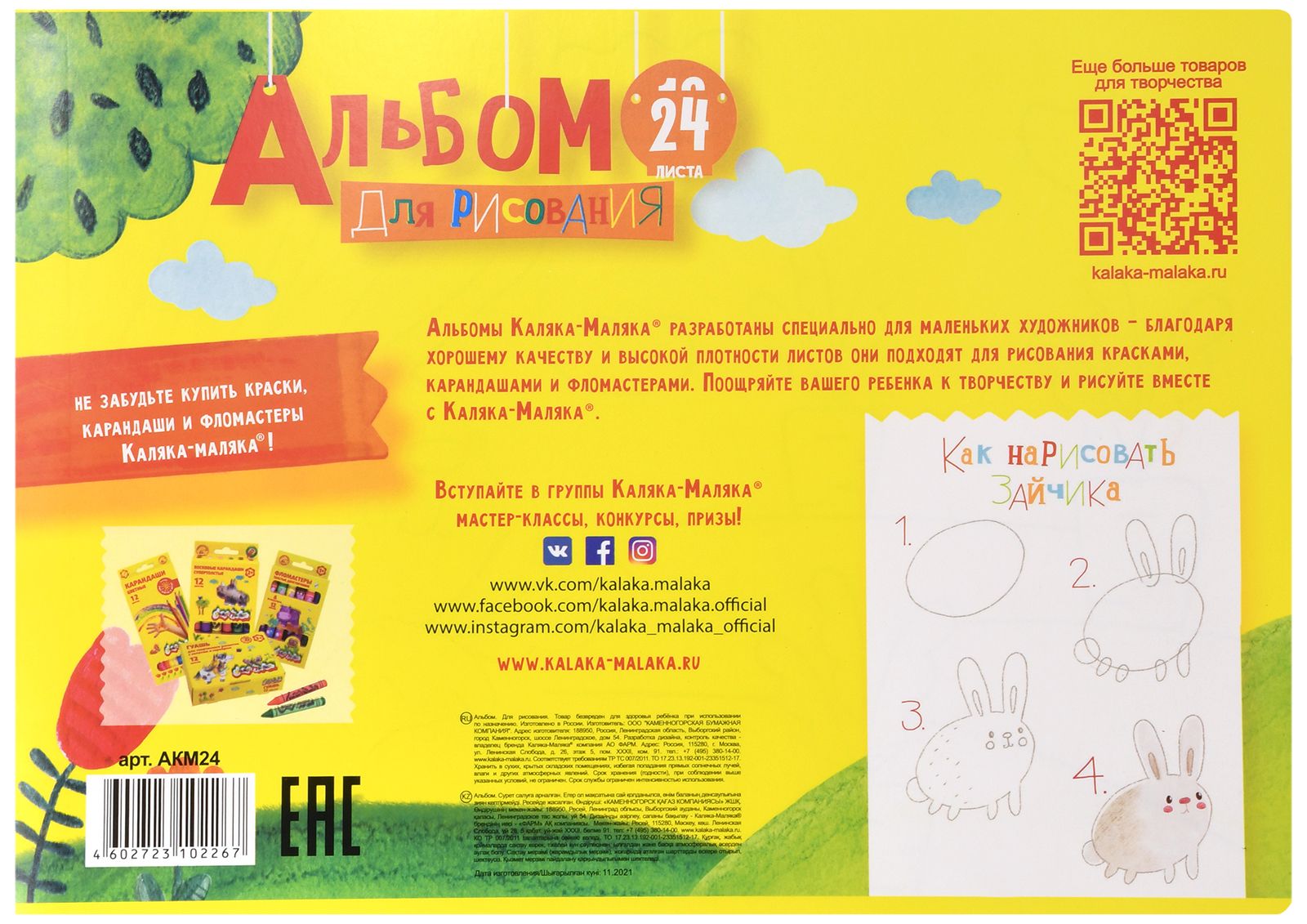 Формат: А4 Количество листов: 24 Тип крепления: гребень Материал обложки: мелованный картон Вид продукции для творчества: Альбом для рисования Вид бумаги внутреннего блока: офсет Мин. партия и варианты упаковок: 1 / 45 -