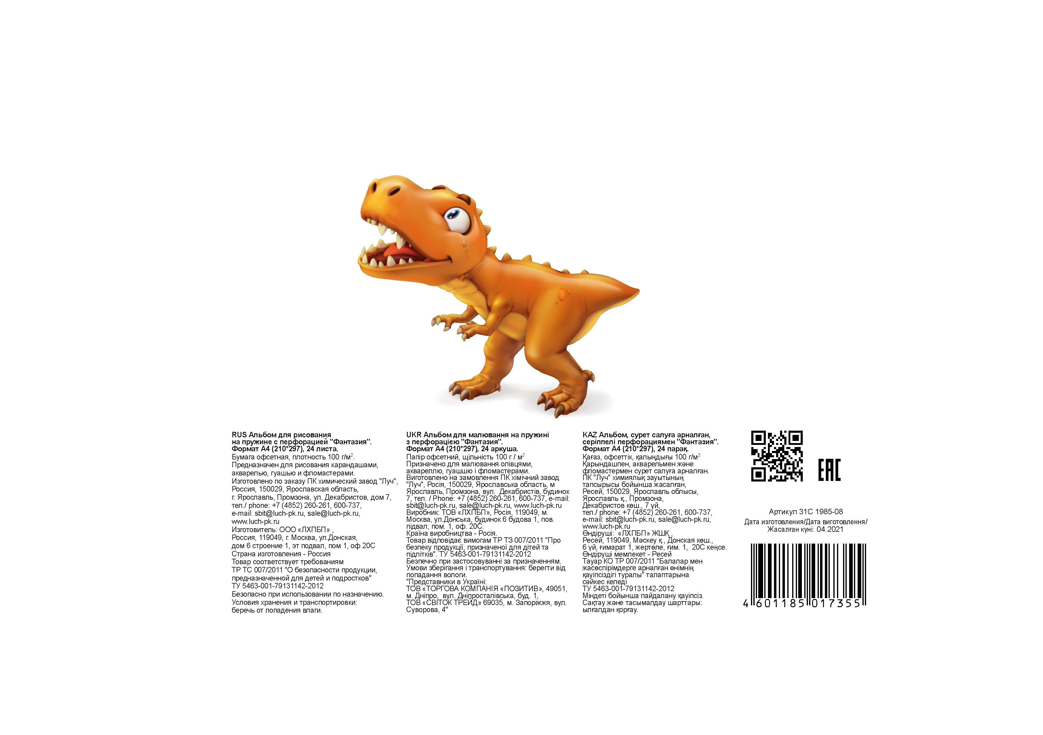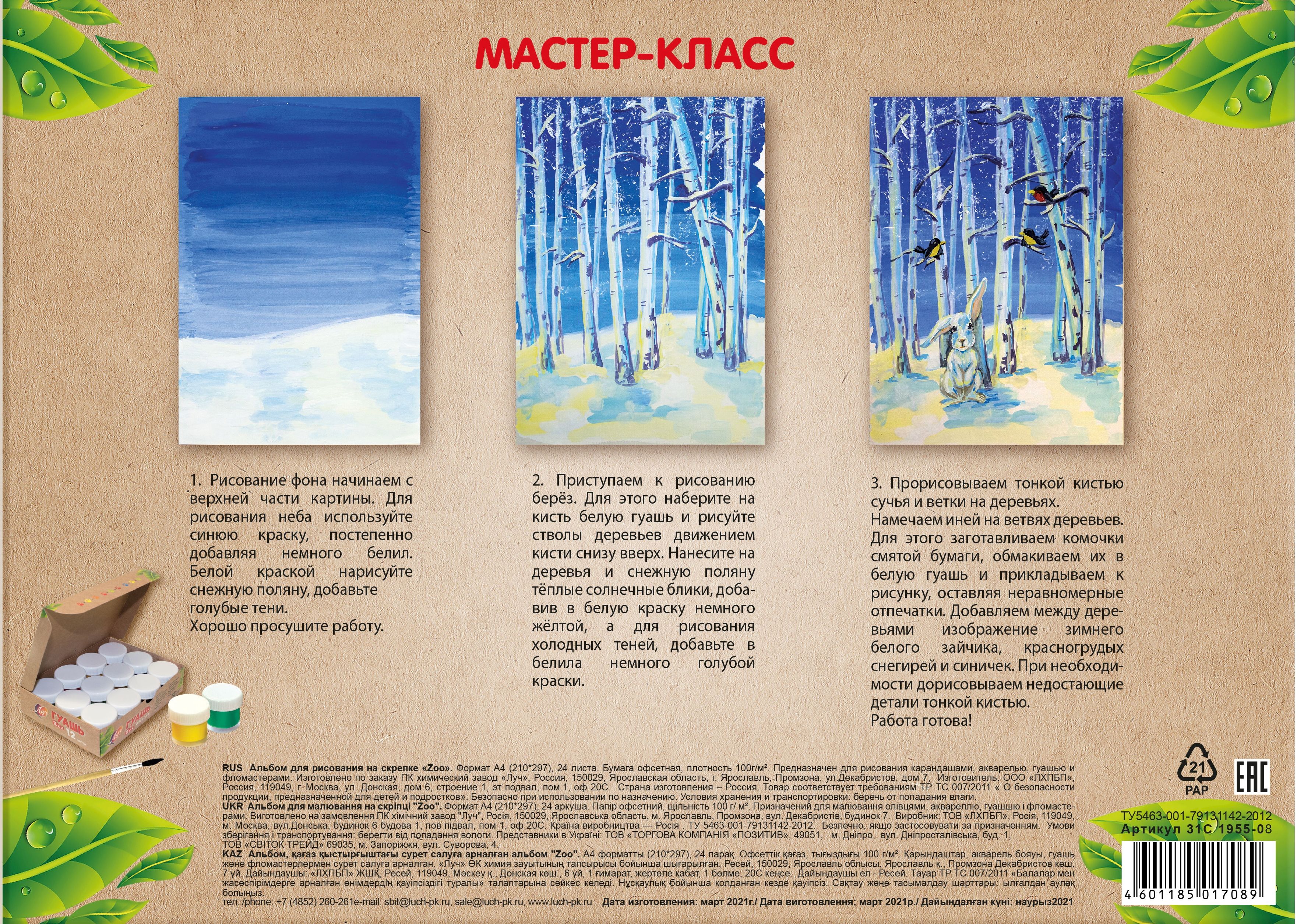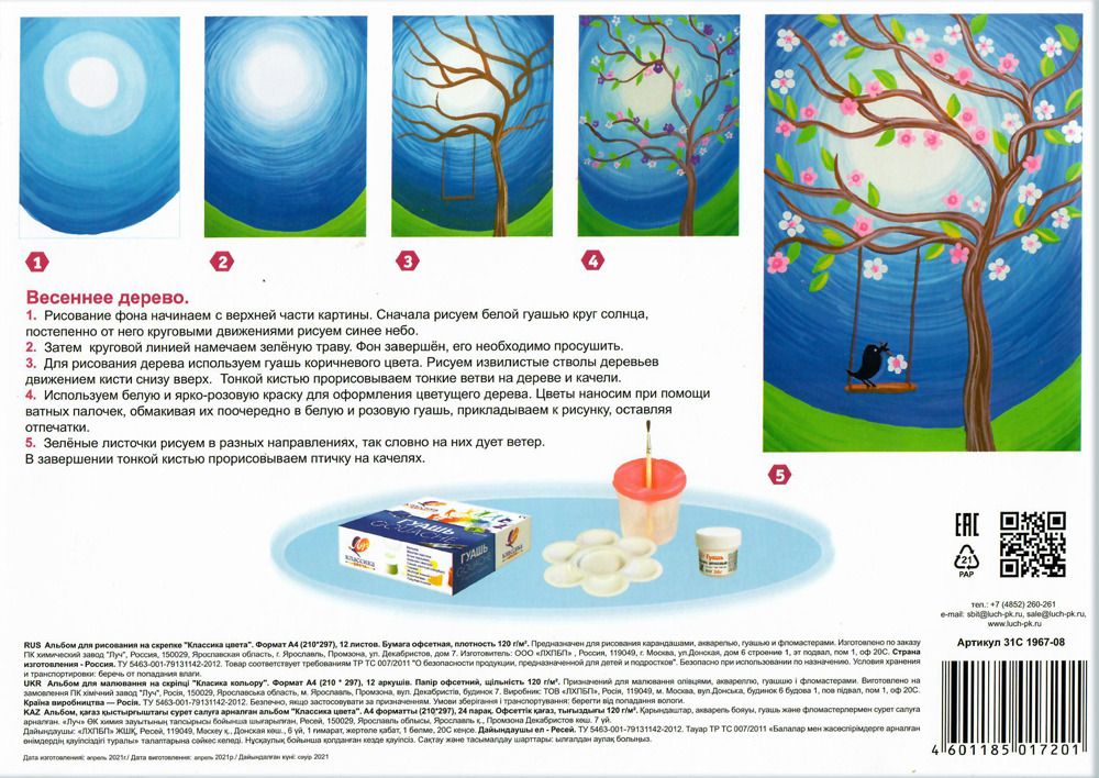 Формат: А4 Количество листов: 24 Тип крепления: склейка Материал обложки: мелованный картон Вид продукции для творчества: Альбом для рисования Вид бумаги внутреннего блока: офсет Мин. партия и варианты упаковок: 1 / 45 -