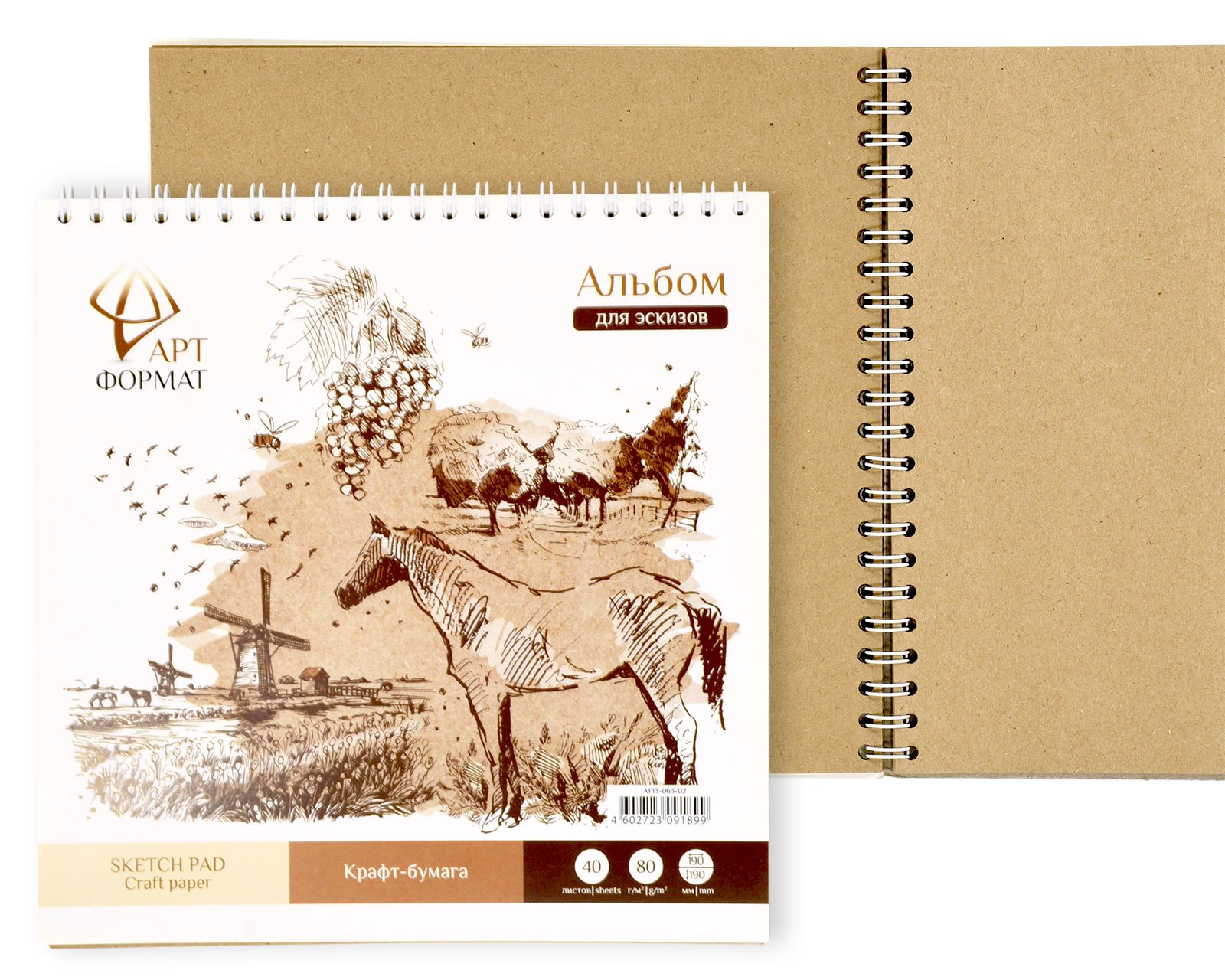 Формат: нет Количество листов: 40 Тип крепления: гребень Материал обложки: мелованный картон Вид продукции для творчества: Альбом для эскизов Вид бумаги внутреннего блока: крафт Мин. партия и варианты упаковок: 1 / 20 -