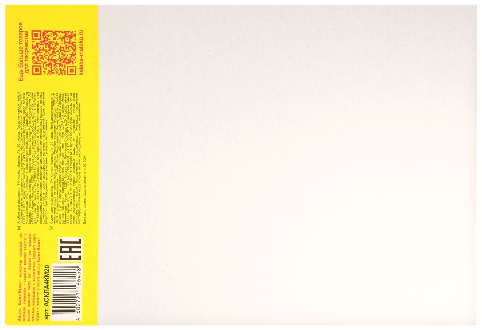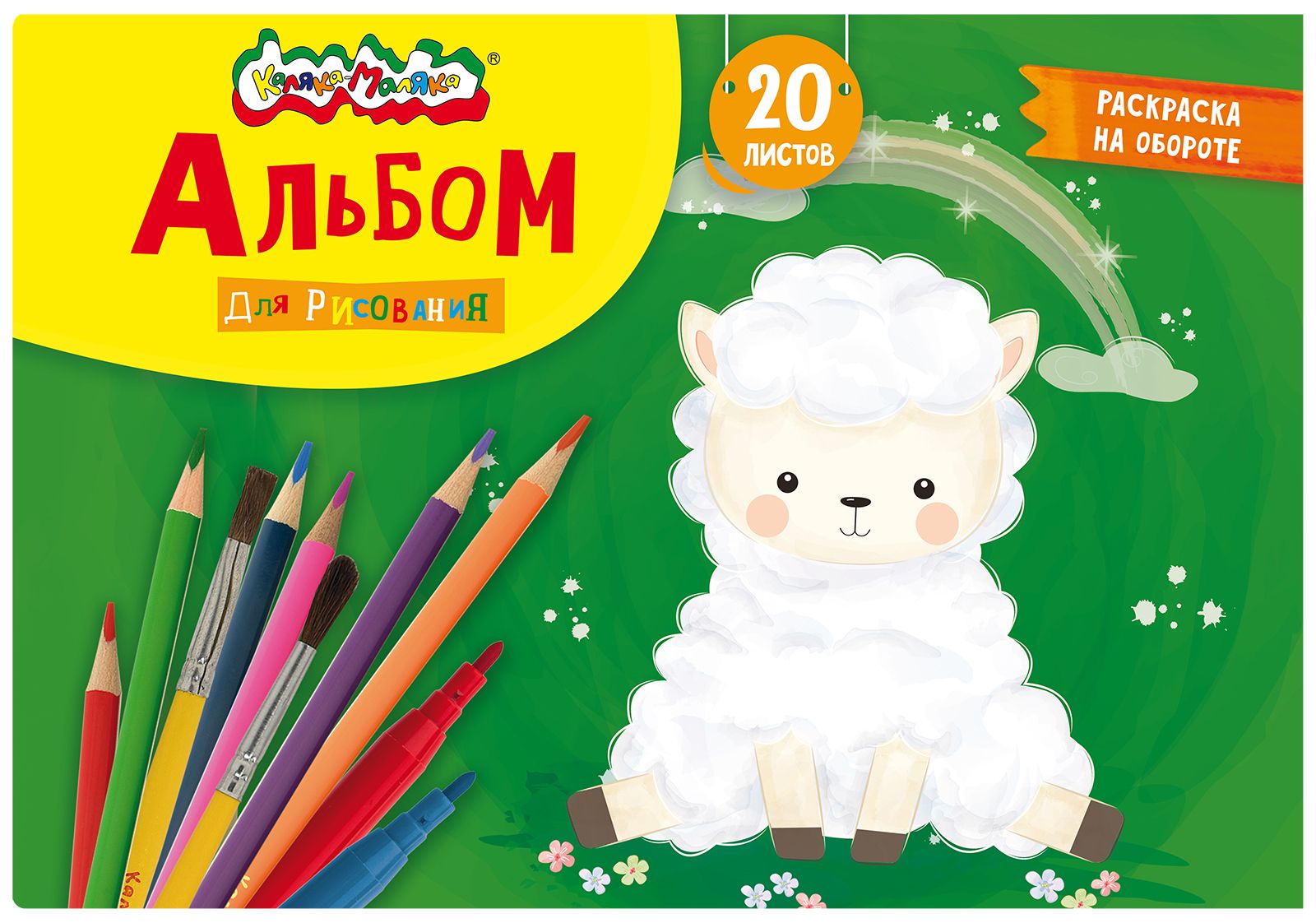 Формат: А4 Количество листов: 20 Тип крепления: склейка Материал обложки: целлюлозный картон Вид продукции для творчества: Альбом для рисования Вид бумаги внутреннего блока: офсет Мин. партия и варианты упаковок: 1 / 2 / 56 Альбом для рисования 20 л. А4, склейка Каляка-Маляка целлюлозный картон, ВД-лак, офсетная бумага, раскраска на обороте