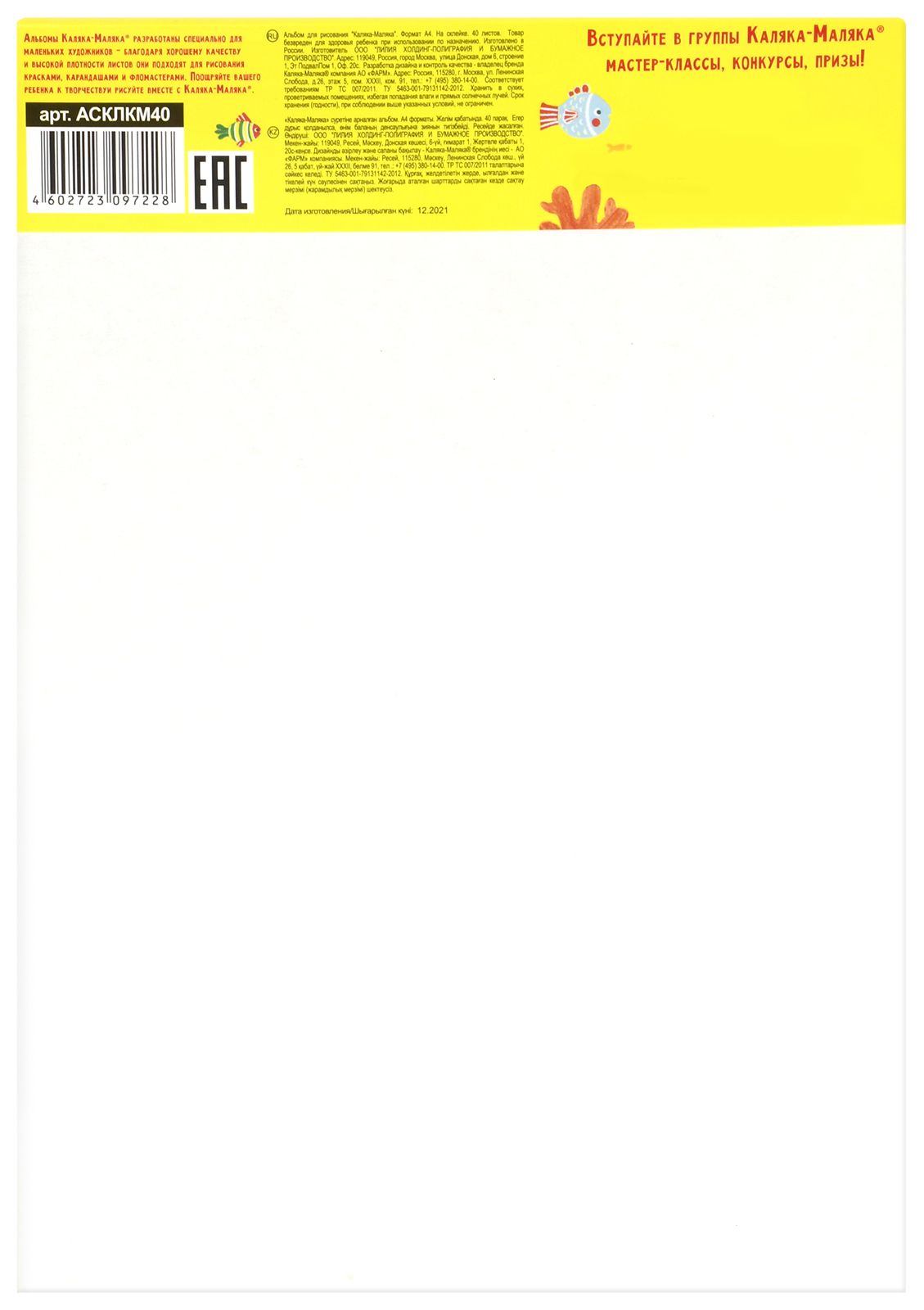 Формат: А4 Количество листов: 40 Тип крепления: склейка Материал обложки: мелованный картон Вид продукции для творчества: Альбом для рисования Вид бумаги внутреннего блока: офсет Мин. партия и варианты упаковок: 1 / 20 Альбом для рисования 40 л. А4, склейка Каляка-Маляка мелованный картон, ВД-лак, офсетная бумага