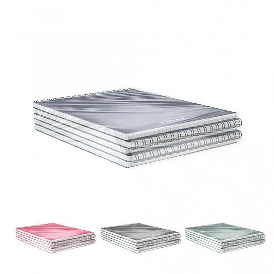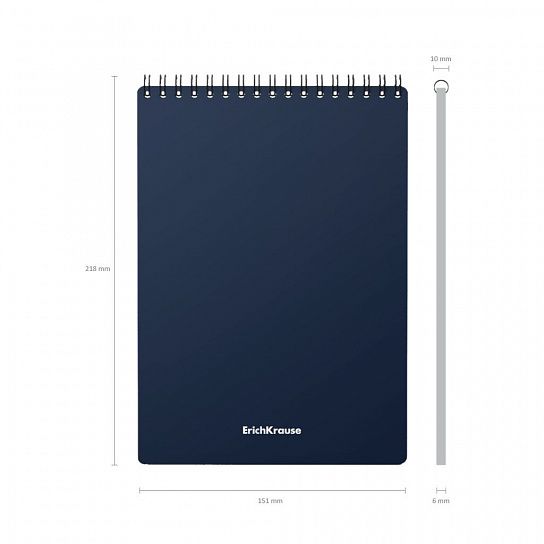 Блокнот формата А5 (148x210 мм). Обложка из высококачественного износостойкого матового пластика с фактурой «песок». В блоке 60 листов в клетку. Бумага офсетная плотностью 55 г/м2. Цвет линовки — синий. Скругленные уголки обложки. Тип скрепления — спираль.Блокноты одного цвета упакованы в термоусадочную пленку по 5 штук. Товар поставляется в нескольких вариантах цвета без возможности выбора.