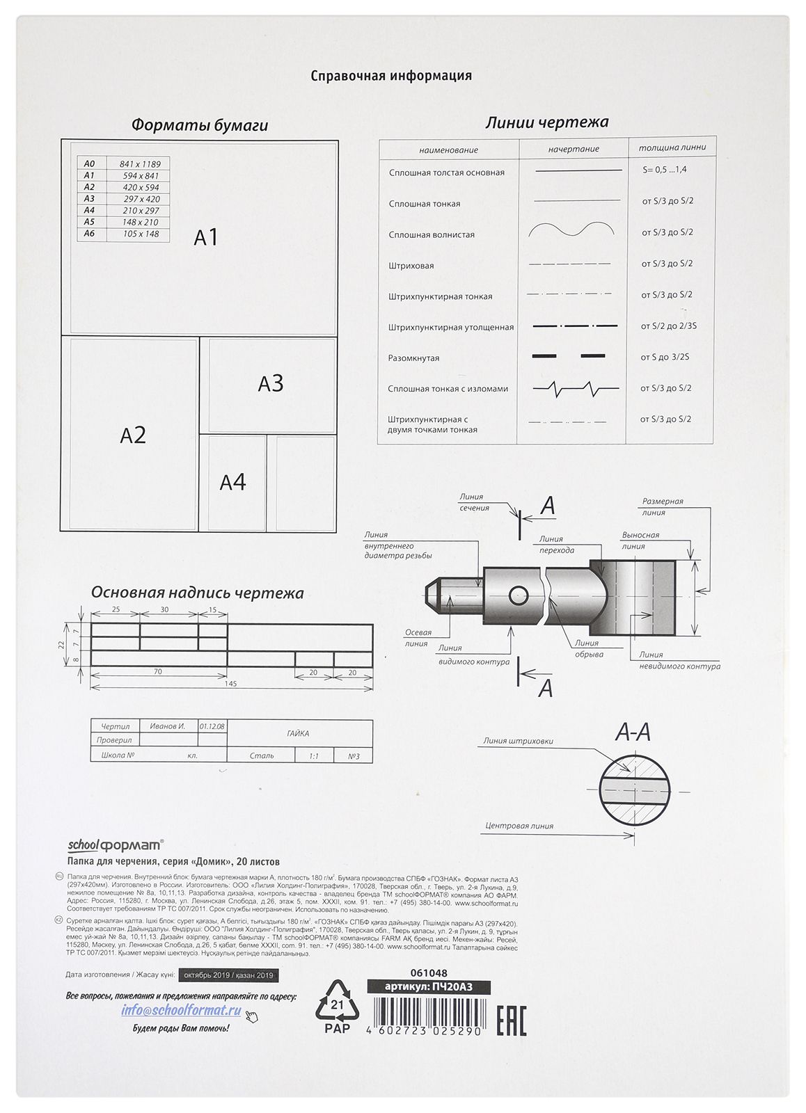 Формат: А3 Плотность, г/м2: 180 Количество листов: 20 Тип крепления: без скрепления Вид бумаги внутреннего блока: ватман Торговая марка: Schoolformat Мин. партия и варианты упаковок: 1 / 20 Папка для черчения 20 л. А3 Schoolformat ватман 180 г/м2