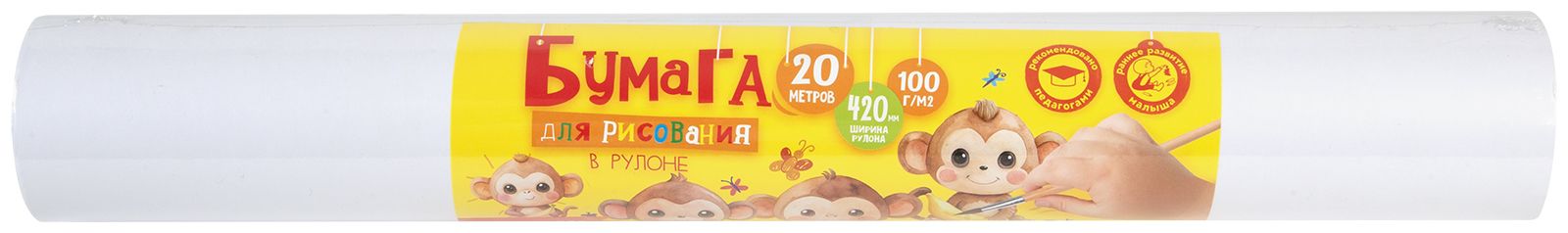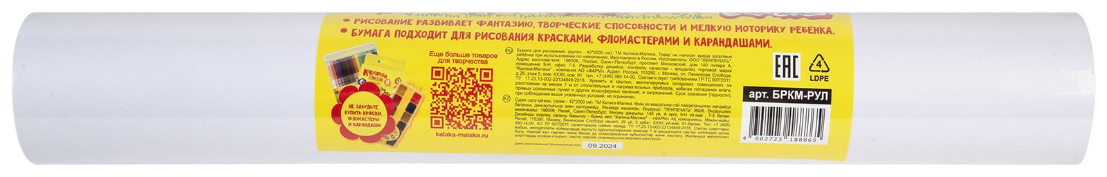 Формат: нет Плотность, г/м2: 100 Вид продукции для творчества: Бумага рисовальная Размер: 420x2000 мм Вид бумаги внутреннего блока: офсет Цвет бумаги в блоке: белый Мин. партия и варианты упаковок: 1 / 10 Бумага рисовальная Каляка-Маляка в рулоне