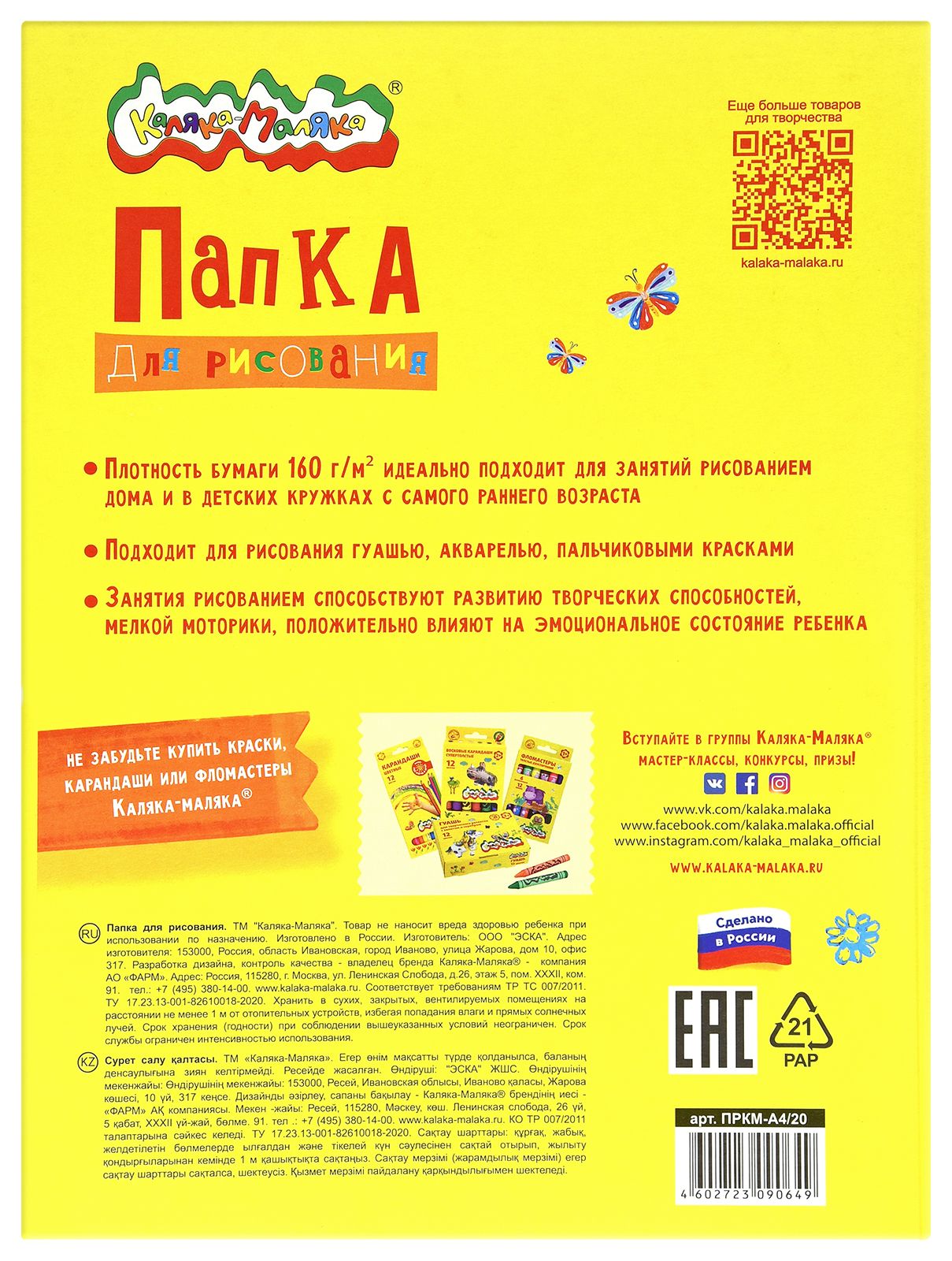 Формат: А4 Плотность, г/м2: 160 Количество листов: 20 Материал обложки: картон Вид продукции для творчества: Папка для рисования Размер: 210х297 мм Мин. партия и варианты упаковок: 1 / 25 Папка для рисования Каляка-Маляка А4, 20 листов, 160 г/м2