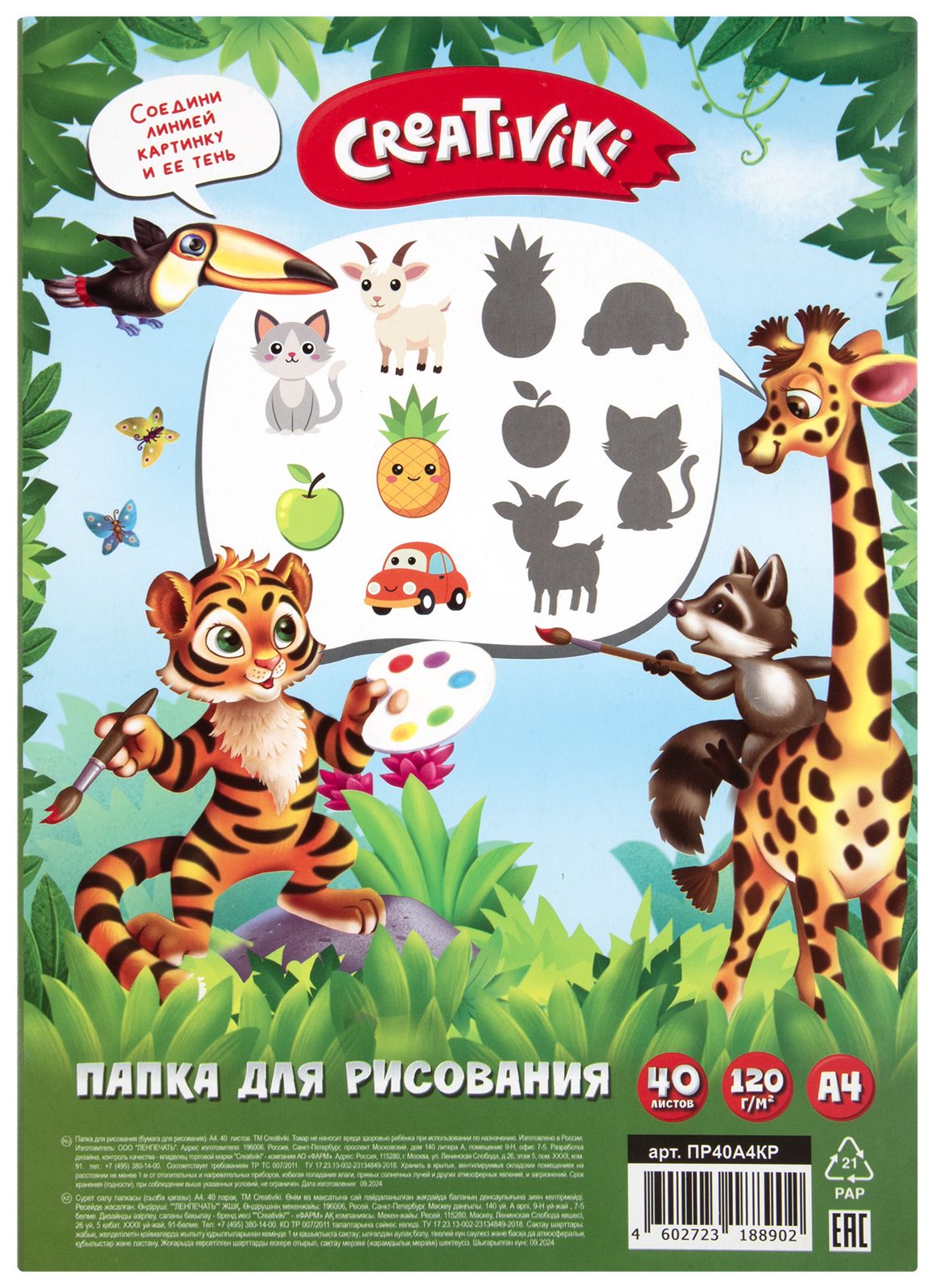 Формат: А4 Плотность, г/м2: 120 Количество листов: 40 Материал обложки: мелованный картон Вид продукции для творчества: Папка для рисования Размер: 210х297 мм Мин. партия и варианты упаковок: 1 / 20 Папка для рисования А4 40 л. Creativiki офсет 120 г/м2