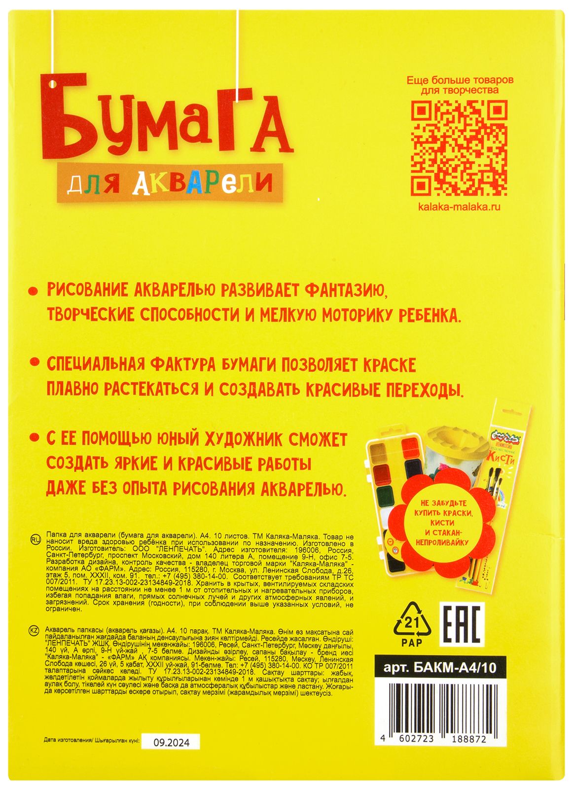 Формат: А4 Плотность, г/м2: 180 Количество листов: 10 Материал обложки: мелованный картон Вид продукции для творчества: Папка для акварели Размер: 210х297 мм Мин. партия и варианты упаковок: 1 / 30 -