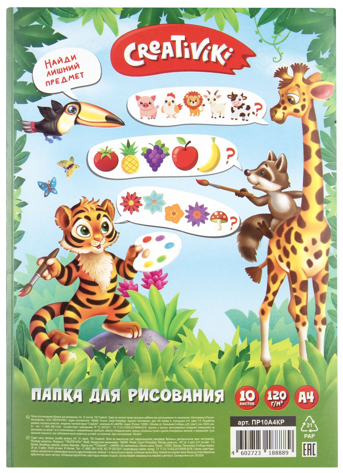 Формат: А4 Плотность, г/м2: 120 Количество листов: 10 Материал обложки: мелованный картон Вид продукции для творчества: Папка для рисования Размер: 210х297 мм Мин. партия и варианты упаковок: 1 / 60 Папка для рисования А4 10 л. Creativiki офсет 120 г/м2