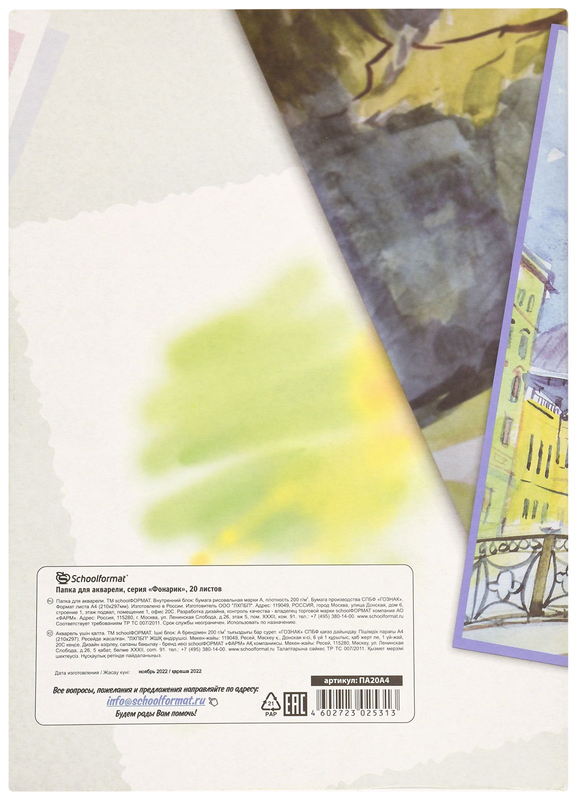 Формат: А4 Плотность, г/м2: 200 Количество листов: 20 Материал обложки: мелованный картон Вид продукции для творчества: Папка для акварели Размер: 210х297 мм Мин. партия и варианты упаковок: 1 / 30 -