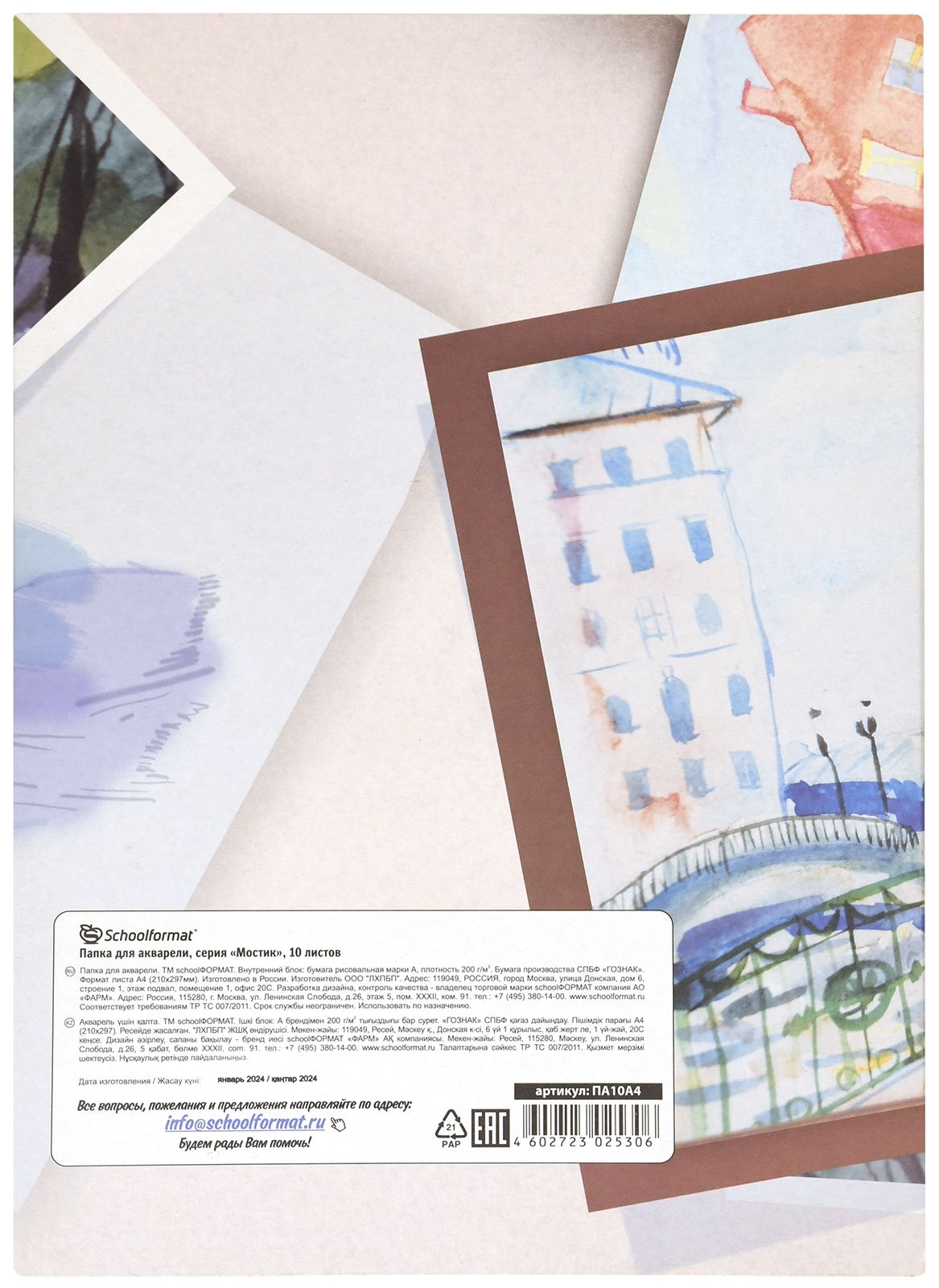 Формат: А4 Плотность, г/м2: 200 Количество листов: 10 Материал обложки: мелованный картон Вид продукции для творчества: Папка для акварели Размер: 210х297 мм Мин. партия и варианты упаковок: 1 / 30 -