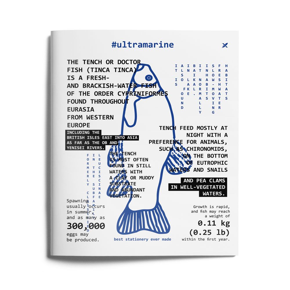 Формат: А5 Количество листов: 48 Тип крепления: скрепка Материал обложки: мелованный картон Линовка: клетка Размер: 165х203 мм Мин. партия и варианты упаковок: 1 / 5 / 80 Тетрадь 48 л. А5 клетка, на скрепке, офсет LOREX ULTRAMARINE мелованный картон, запечатка форзаца, soft touch, выборочный УФ-лак