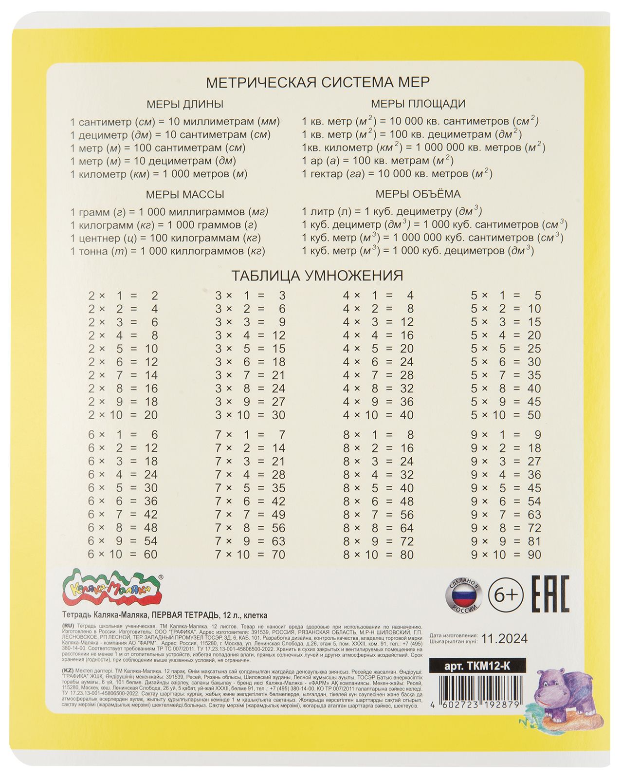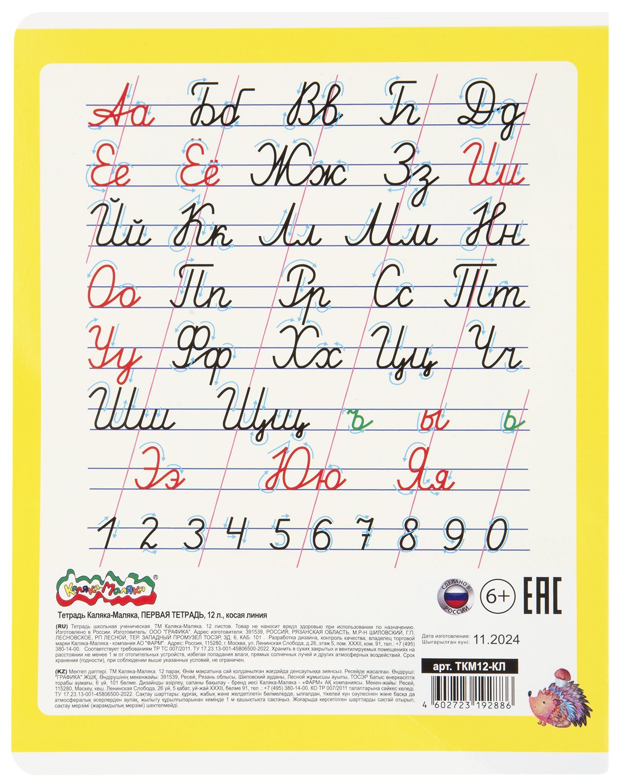 Формат: А5 Количество листов: 12 Тип крепления: скрепка Материал обложки: мелованный картон Линовка: клетка Вид бумаги внутреннего блока: офсет Мин. партия и варианты упаковок: 1 / 12 / 168 Тетрадь 12 л. клетка Каляка-Маляка ПЕРВАЯ ТЕТРАДЬ мелованный картон, запечатка форзаца, ВД-лак