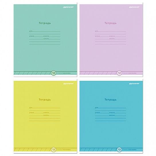 Формат: А5 Количество листов: 12 Тип крепления: скрепка Материал обложки: мелованный картон Линовка: узкая линия Вид бумаги внутреннего блока: офсет Мин. партия и варианты упаковок: 1 / 12 -