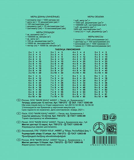 Тетрадь школьная, 12 листов в клетку. Формат 170х203 (+/- 3), на скрепке. Внутренний блок - 60,0 (+/- 3,0) г/м. Материал обложки - бумага обложечная 80 г/м.