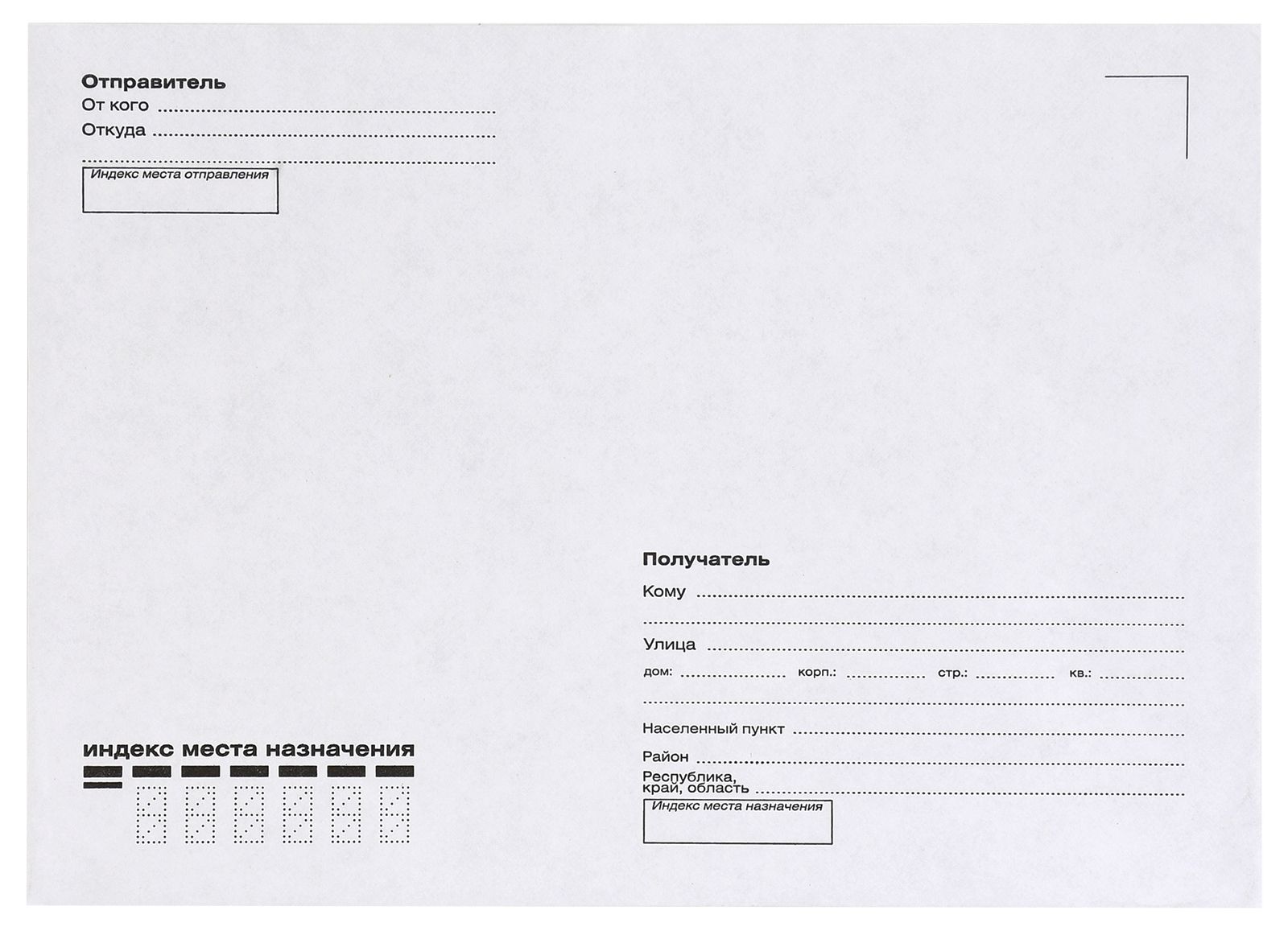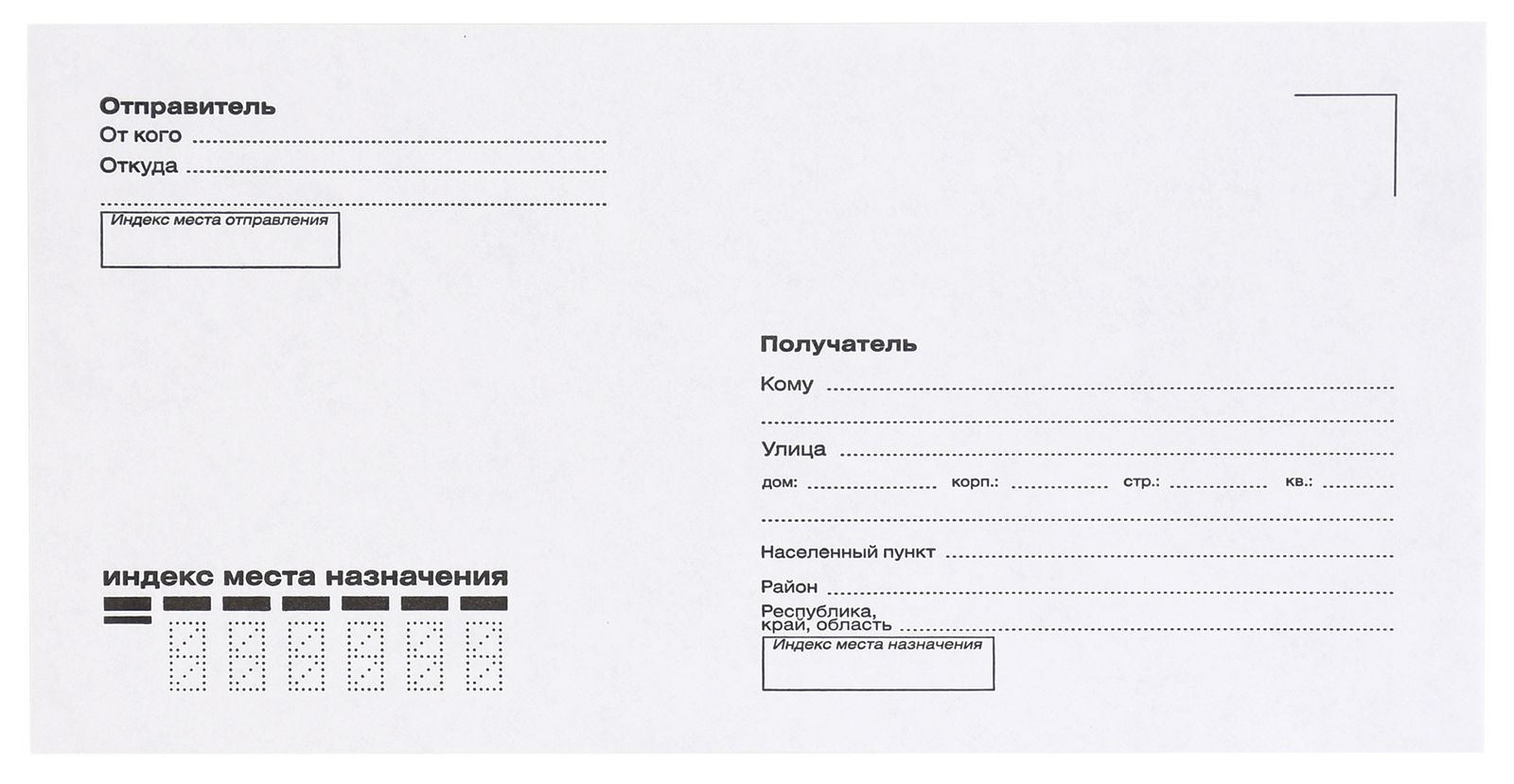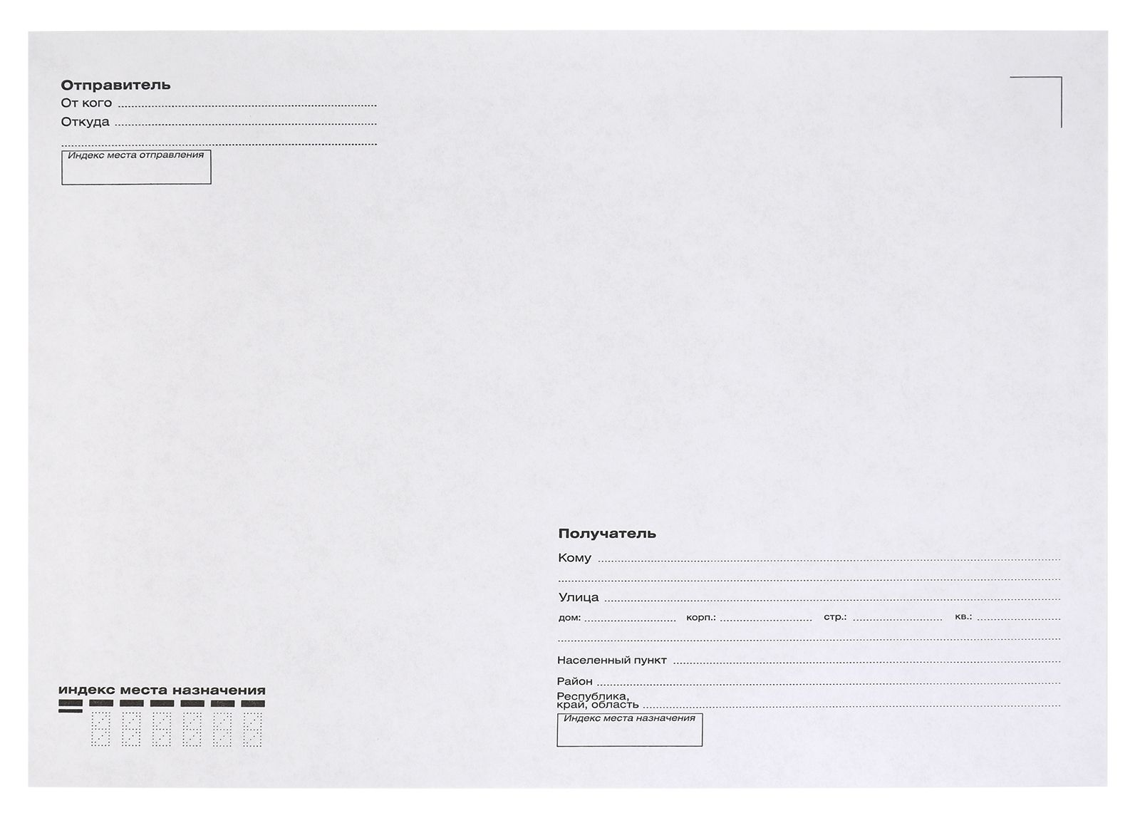 - Оформление. Конверты для писем выпускаются с напечатанными почтовыми марками, размеченными полями для информации об отправителе и адресате. Также есть варианты с чистыми поверхностями и прозрачными окошками.