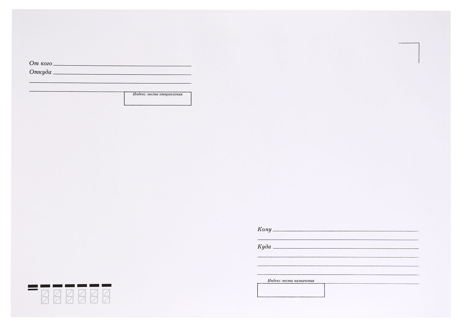 Цвет: белый Плотность, г/м2: 100 Количество в упаковке, шт: 500 Размер: 229х324 мм Формат конверта: С4 Способ заклеивания: стрип Мин. партия и варианты упаковок: 1 / 500 Конверт почтовый С4 (229х324) КУДА-КОМУ, белый, стрип, 100 г/м2