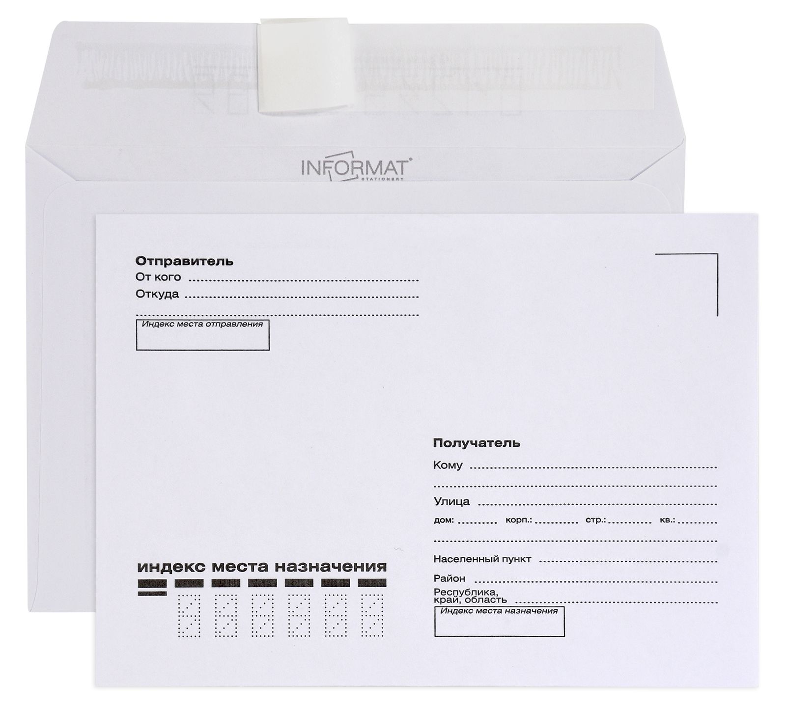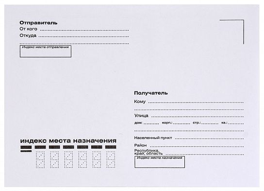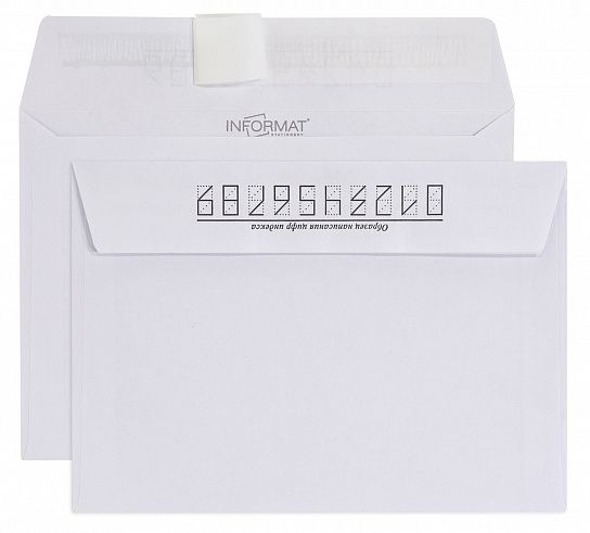 Конверт С6 (114х162 мм) — другое название "отечественный конверт", вмещает лист А4, сложенный вчетверо, или лист А5 формата, сложенный втрое. Конверт выполнен с адресной сеткой "КУДА-КОМУ".