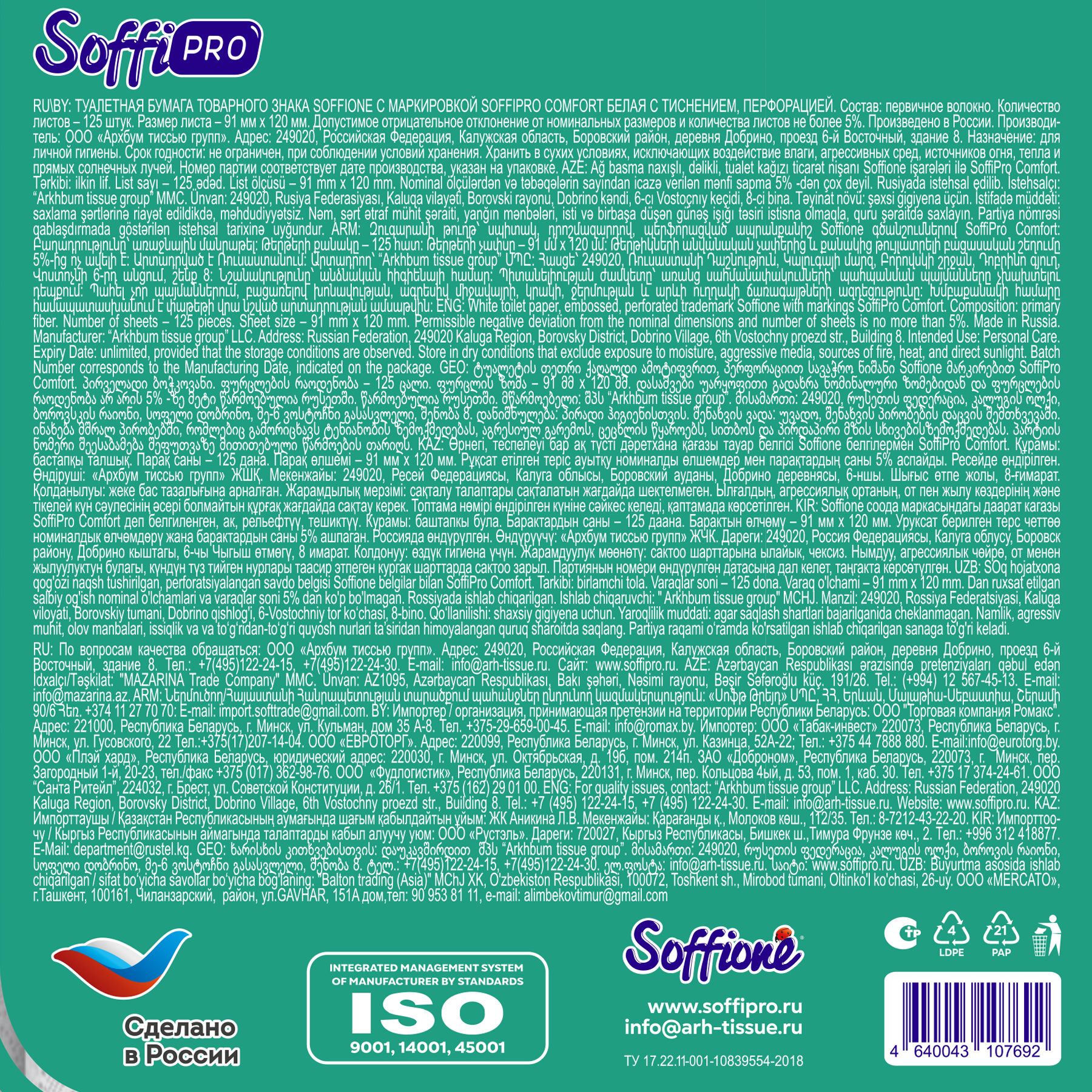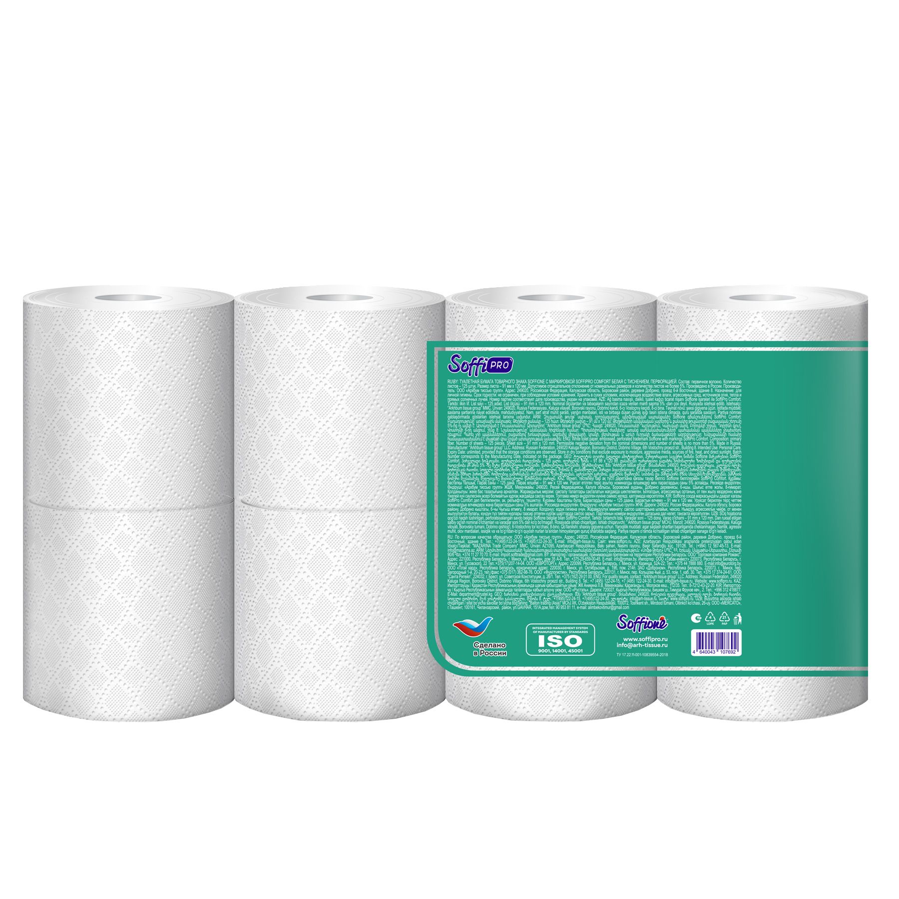 Цвет: белый Количество листов: 124 Вид изделия: Бумага туалетная Количество слоев: 2 слоя Материал: целлюлоза Упаковка: полиэтилен Мин. партия и варианты упаковок: 1 / 8 Бумага туалетная 2 сл. SoffiPRO COMFORT, намотка 15 м 8 шт/упак белый 124 л. целл. Бытовое