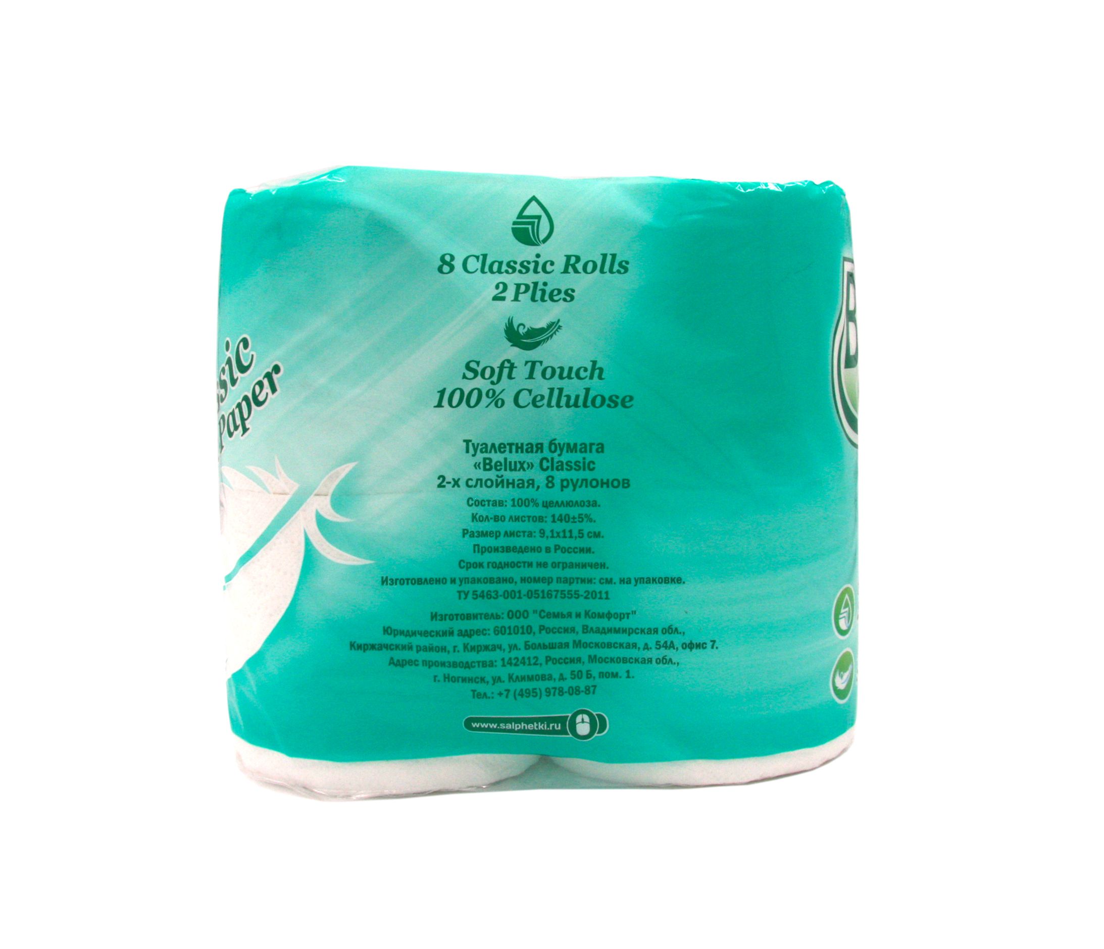 Туалетная бумага Belux Классик 2-х слойная 8 рулонов белая. Размер отрывного листа 115x91 ±5% мм, количество отрывных листов в рулоне 140 ±5%, длина рулона 16 ±0,5 м, целлюлоза 100%.