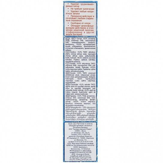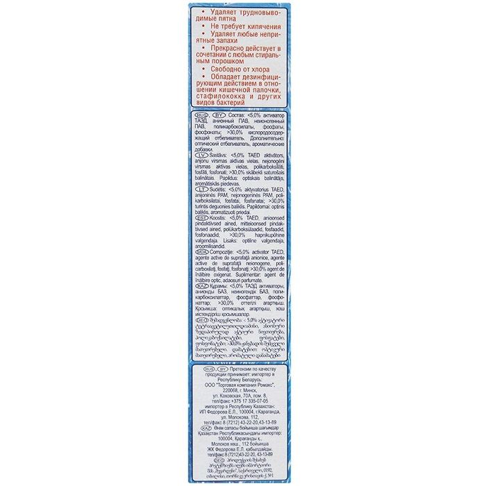 Мягко воздействует на волокна, ткань не теряет прочность, не деформируется и не желтеет. Является активатором стирки, идеально подходит для цветного белья, совместим с любыми моющими средствами. Удаляет трудновыводимые пятна. Дезинфицирует бельё и различные поверхности. Срок годности 24 месяца. ТУ 2383-010-00335215-96.