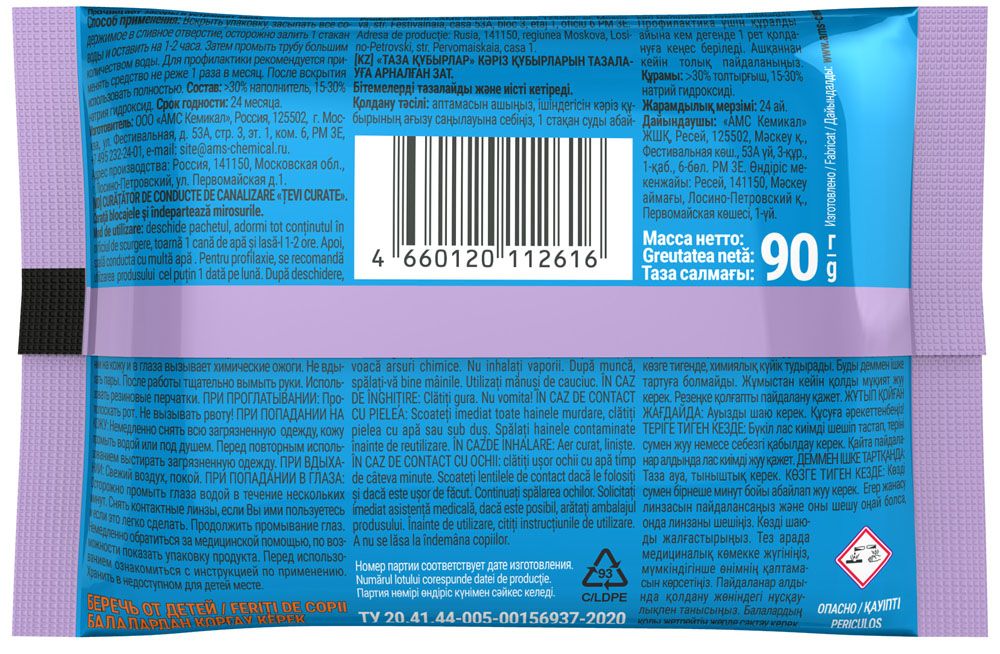 Средство для прочистки канализационных труб «Чистые трубы» предназначено для растворения отложений жирового, минерального и растительного происхождения, образующихся на внутренней стороне трубопроводов и сливных стоков.