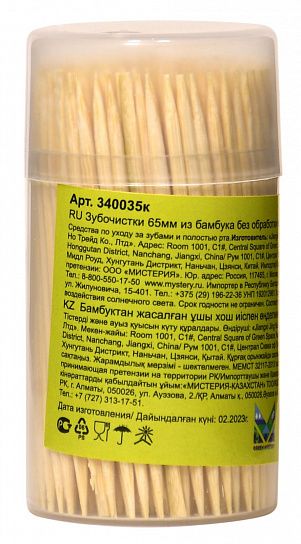 Длина, мм: 65 Материал: бамбук Вид товара: Зубочистки Торговая марка: Мистерия Количество штук в упаковке: 100 шт/упак Назначение: для холодного и горячего Мин. партия и варианты упаковок: 1 / 40 -