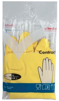 Цвет: желтый Вид товара: Перчатки Размер: L Материал: латекс Упаковка: пакет Серия: PROFESSIONAL Мин. партия и варианты упаковок: 1 / 10 / 50 Перчатки хозяйственные латексные с х/б напылением VILEDA КОНТРАКТ размер L
