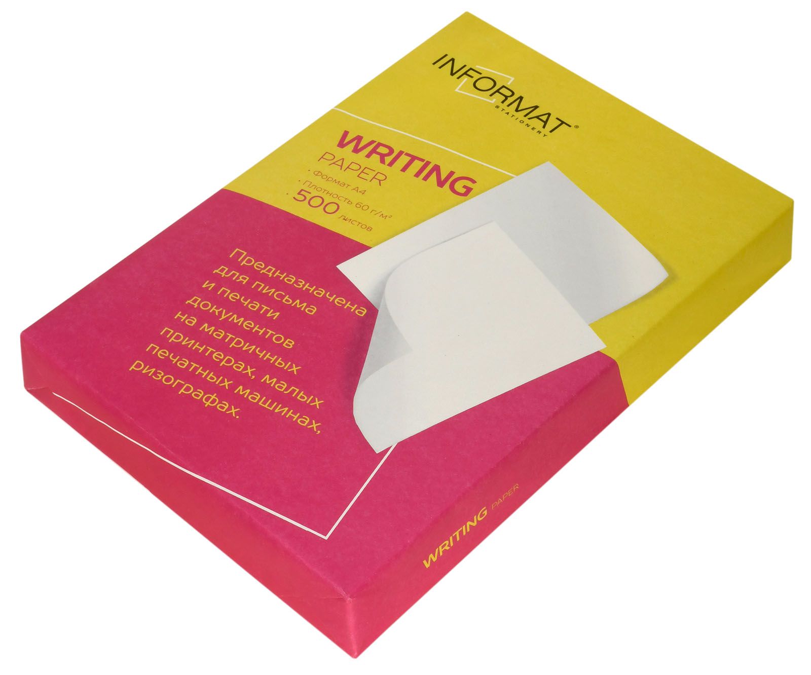 Компания INFORMAT предлагает качественную писчую бумагу от известных производителей. В каталоге вы найдете форматы А3 и А4. Потребительская бумага широко используется на предприятиях, в офисах, учебных учреждениях и для личных нужд. Продукция предназначается для черновиков, предварительных расчетов, зарисовок и т. д. Листы могут заправляться в различные печатные устройства. В каталоге указана цена за пачку.