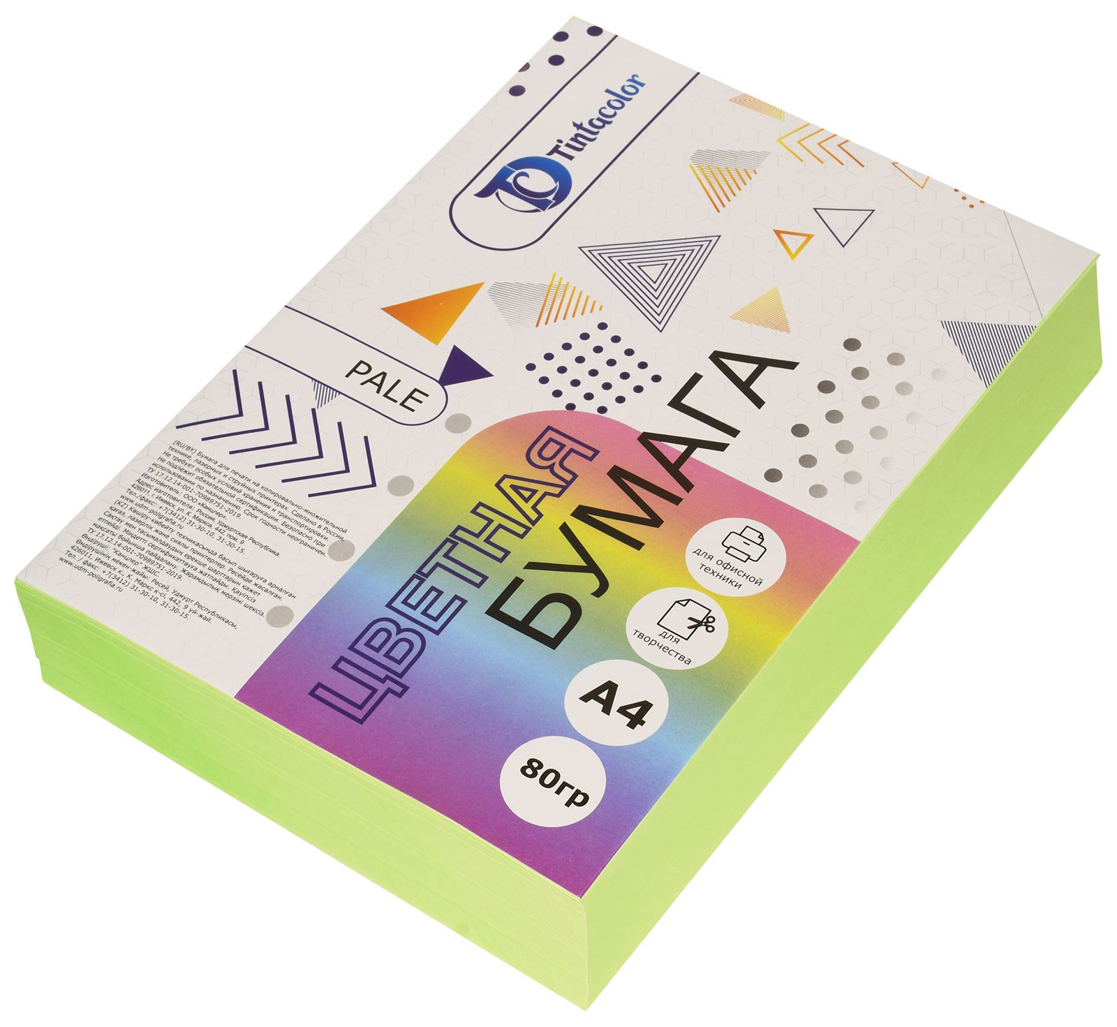 Формат: А4 Плотность, г/м2: 80 Количество листов: 500 Количество цветов: 1 Цвет: зеленый Торговая марка: Tintacolor Мин. партия и варианты упаковок: 1 / 4 -
