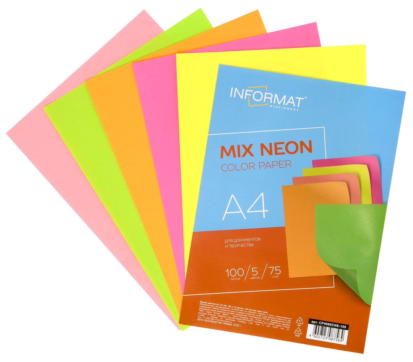 Формат: А4 Плотность, г/м2: 75 Количество листов: 100 Количество цветов: 5 Цвет: ассорти Серия: Neon mix Мин. партия и варианты упаковок: 1 / 10 Бумага цветная для печати INFORMAT NEON MIX А4 5 цветов по 20 л неон ассорти