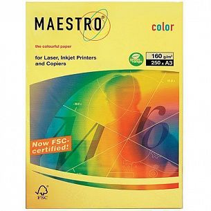 Формат: А3 Плотность, г/м2: 160 Количество листов: 250 Мин. партия и варианты упаковок: 1 / 5 Бумага А3, MAESTRO COLOR, 250 л., 160 г/м2, желтый
