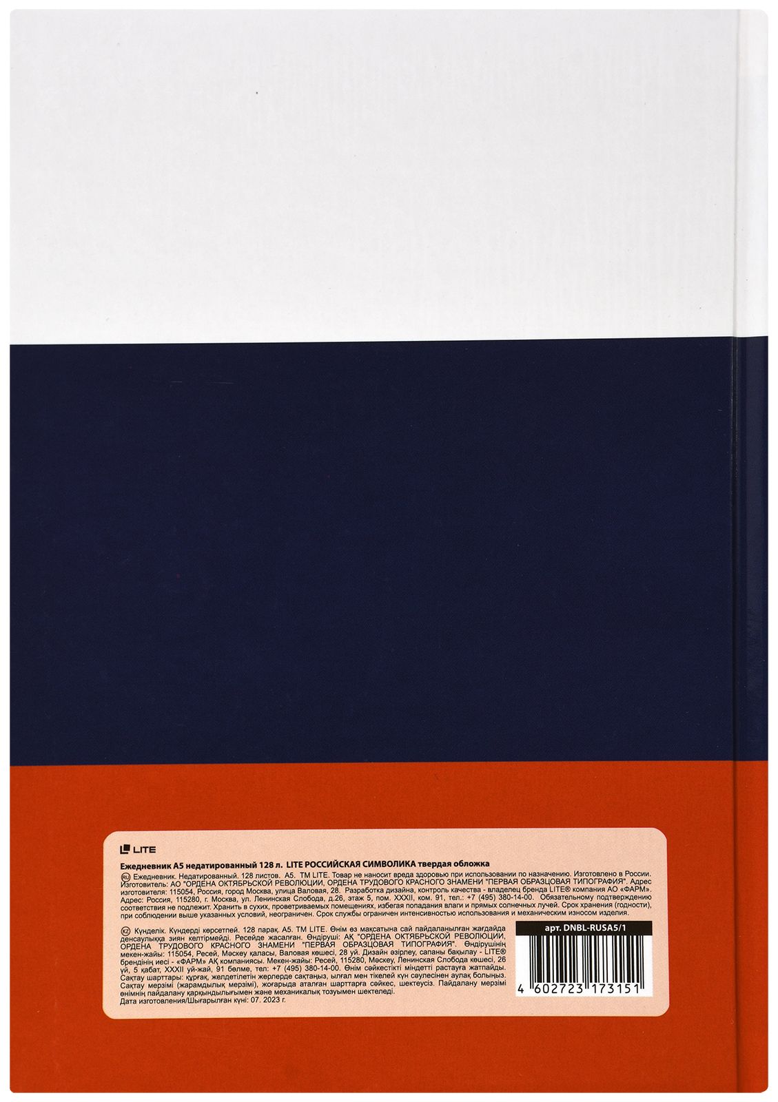 Формат: А5 Количество листов: 128 Материал обложки: 7БЦ Линовка: линия Вид изделия: Ежедневник Степень датированности: недатированный Мин. партия и варианты упаковок: 1 / 20 Ежедневник А5 недатированный LITE РОССИЯ 128 л. с дизайном, твердая обложка 7БЦ, глянцевая ламинация