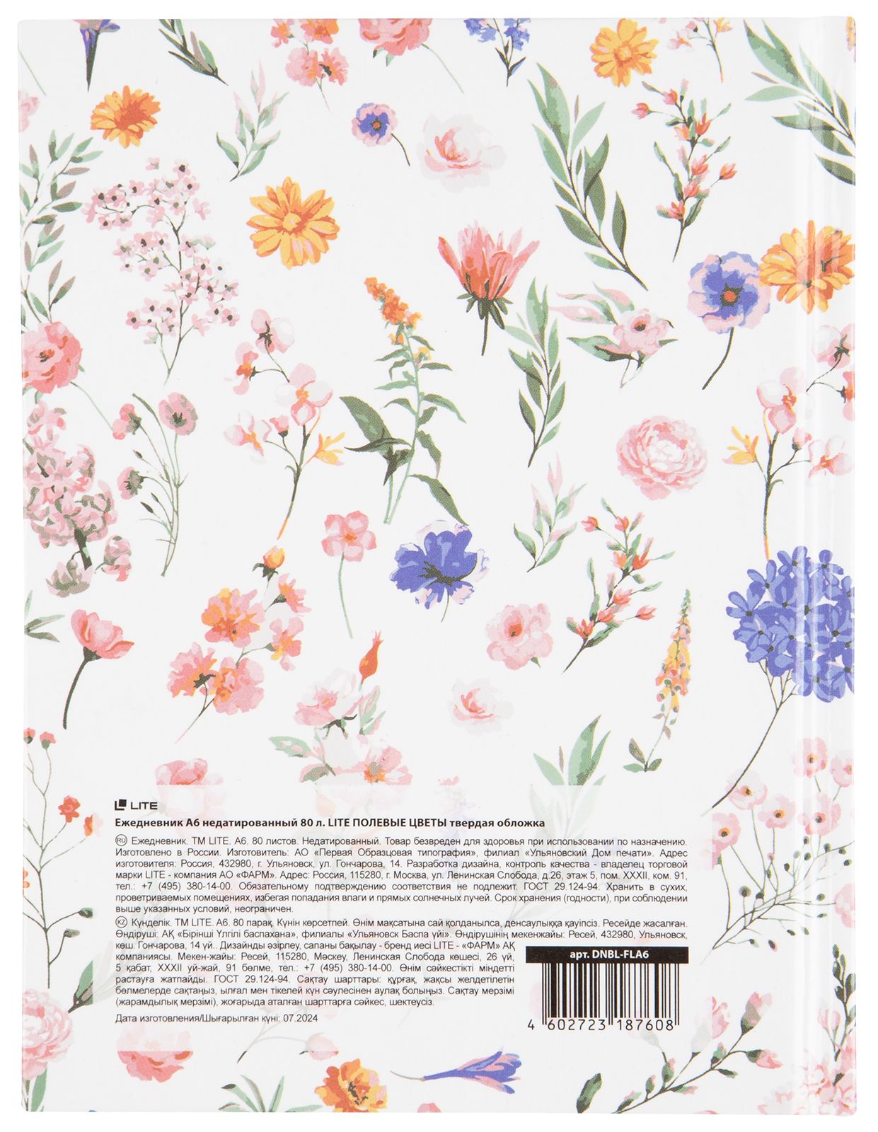 Формат: А6 Количество листов: 80 Материал обложки: картон Линовка: линия Вид изделия: Ежедневник Степень датированности: недатированный Мин. партия и варианты упаковок: 1 / 40 Ежедневник А6 недатированный LITE ПОЛЕВЫЕ ЦВЕТЫ 80 л. с дизайном, твердая обложка картон, глянцевая ламинация